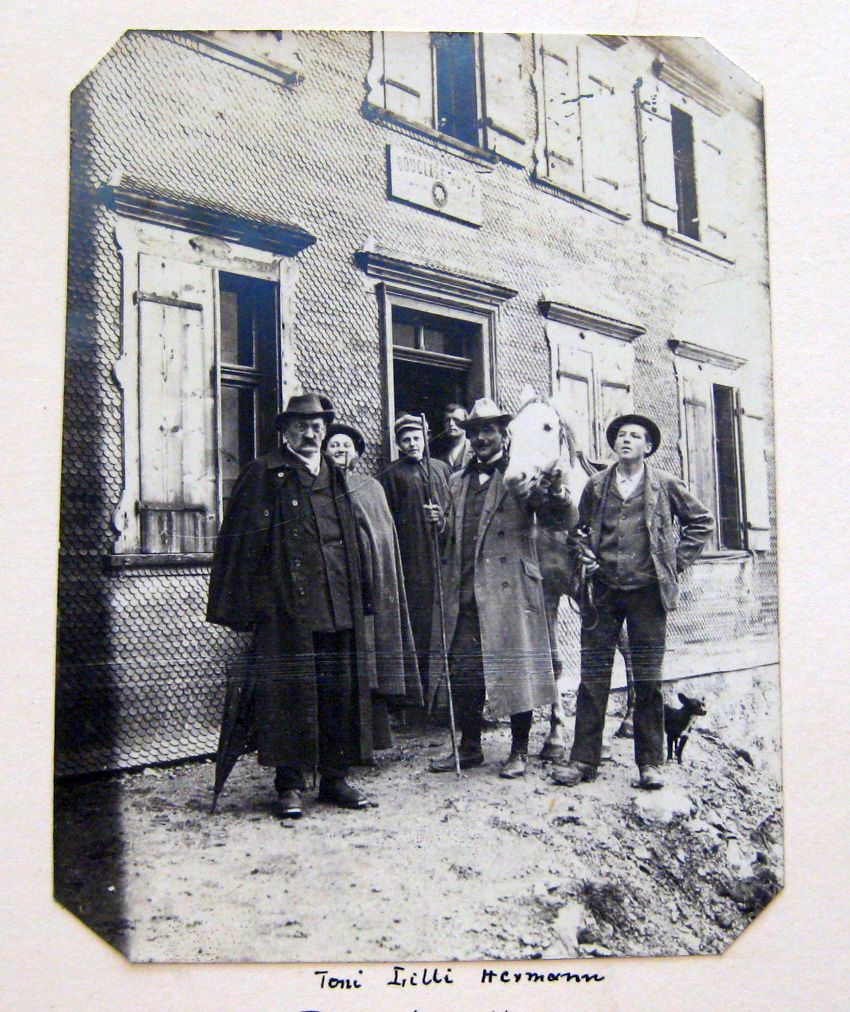 | Dateiinfo (Bild-Unterschrift und Info-Box, automatisch erstellt) | Hermann Friedreich (Pferd haltend) mit Schwiegervater Wilhelm von Leube, Ehefrau Antonie und ... Hermann Friedreich (Pferd haltend) mit Schwiegervater Wilhelm von Leube, Ehefrau Antonie und Schwägerin Lilli Bumm vor der Douglasshütte im Vorarlberger Rätikon (© Gemeindearchiv Langenargen)<br>Urheber: unbekannt<br>Lizenz: copyright | ||