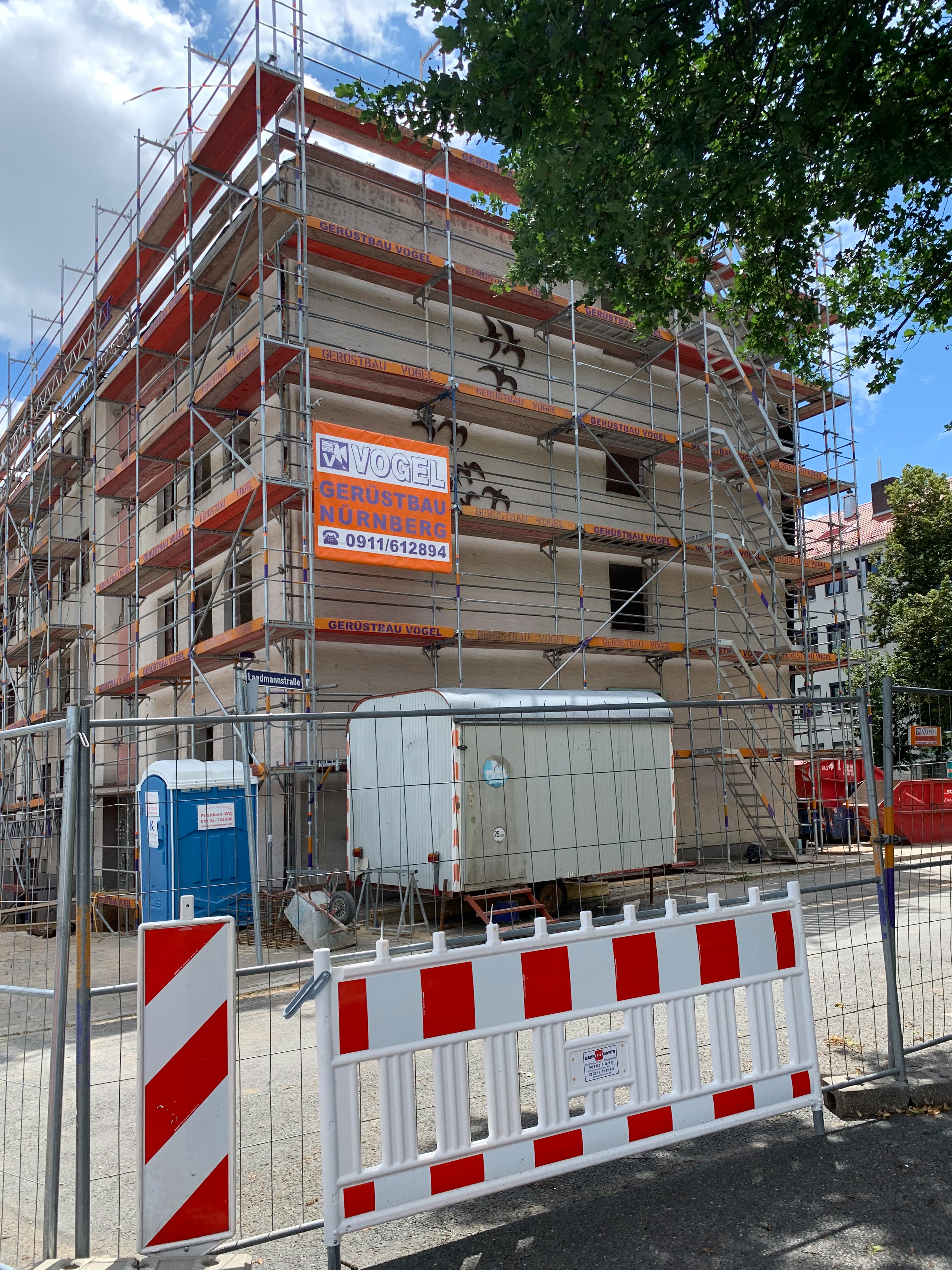 | Beschreibung | Sanierung des Gebäudes Leyher Straße 36, hier noch mit den ehem. Kunstwerken von Gudrun Kunstmann, Juli 2020 | ||