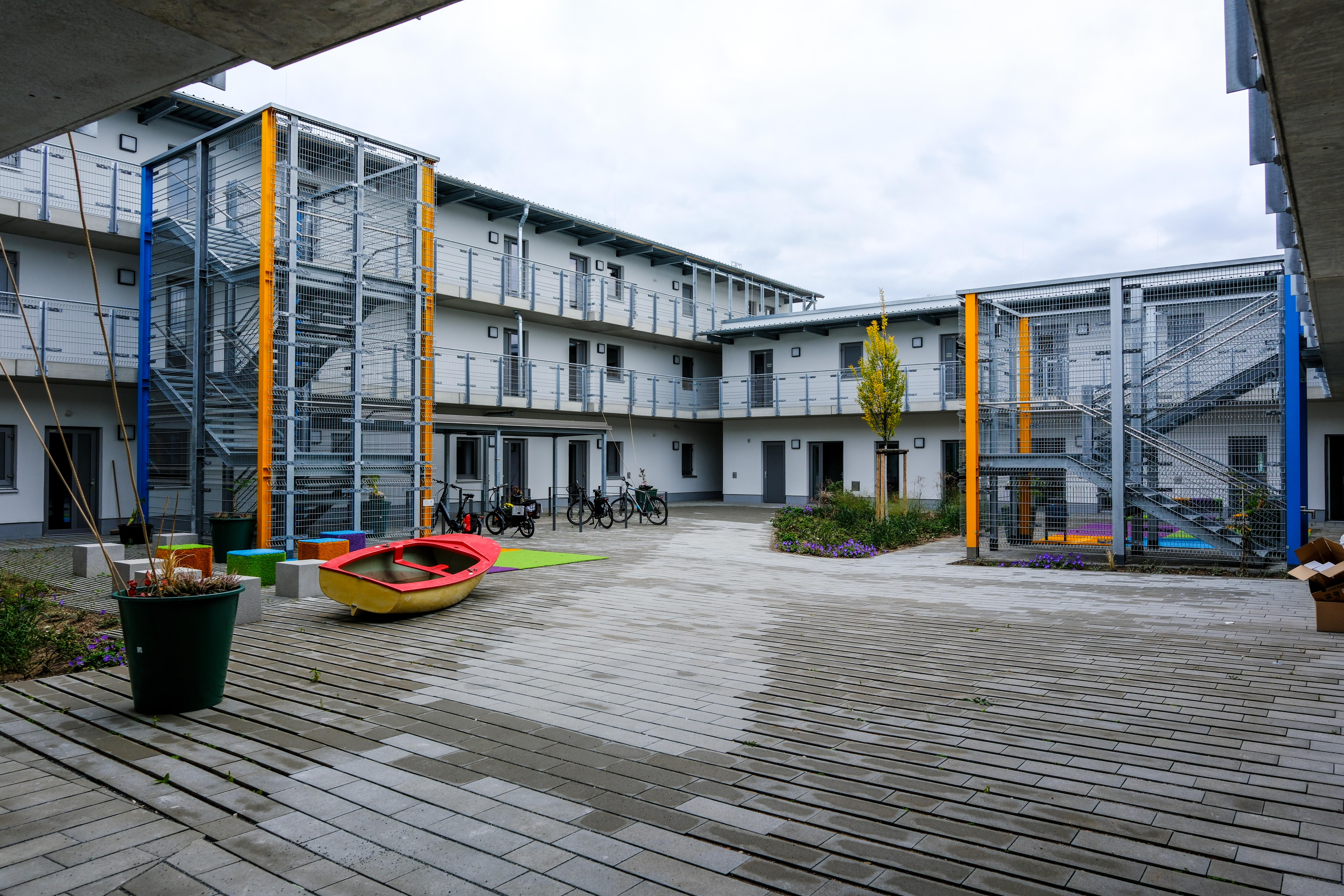 BeschreibungDas neue Obdachlosenheim in der Leyher Straße - Innenhof des Obdachlosenheims, Okt. 2025