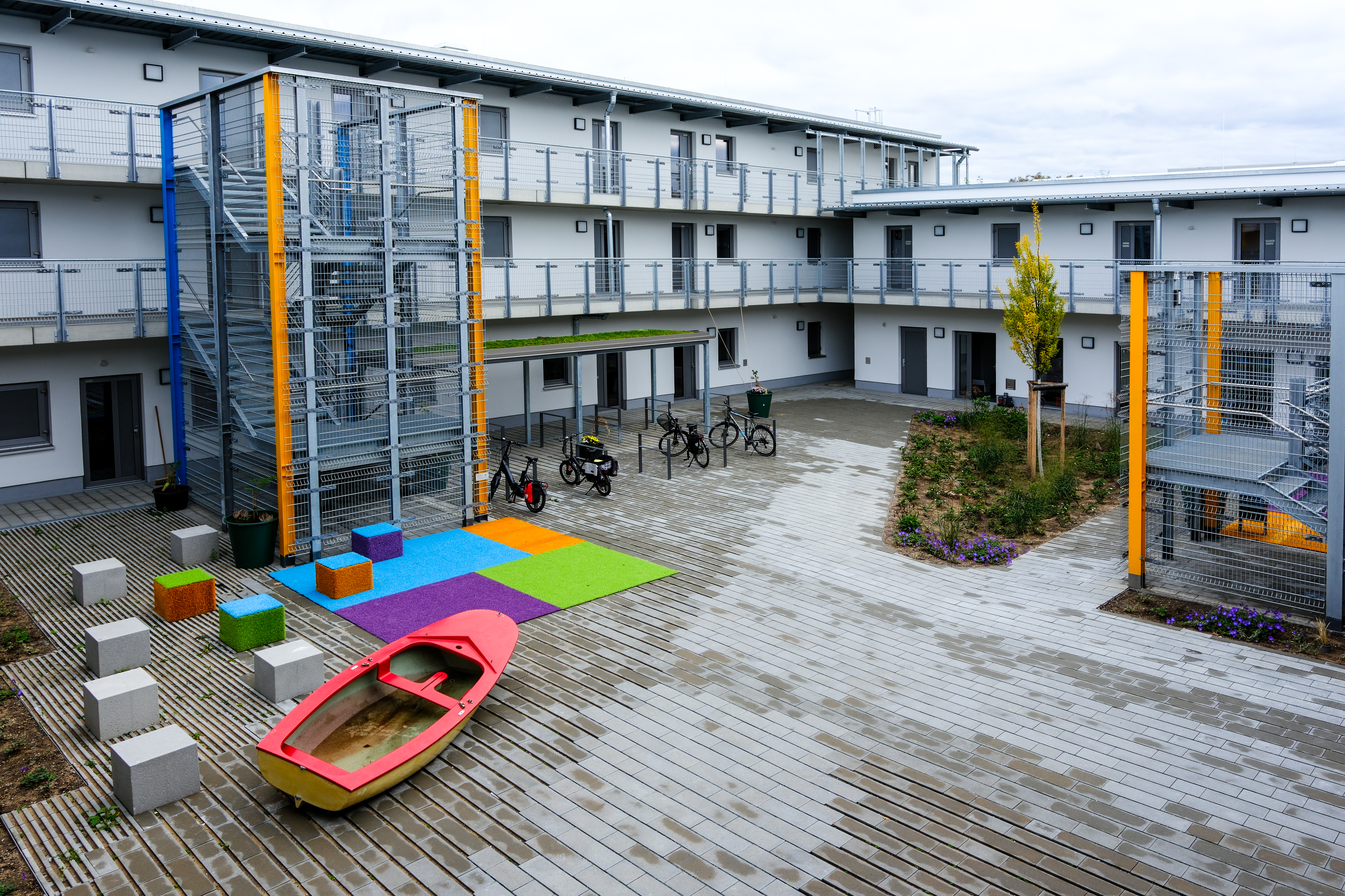 BeschreibungDas neue Obdachlosenheim in der Leyher Straße - im Innenhof des Obdachlosenheim, Okt. 2025