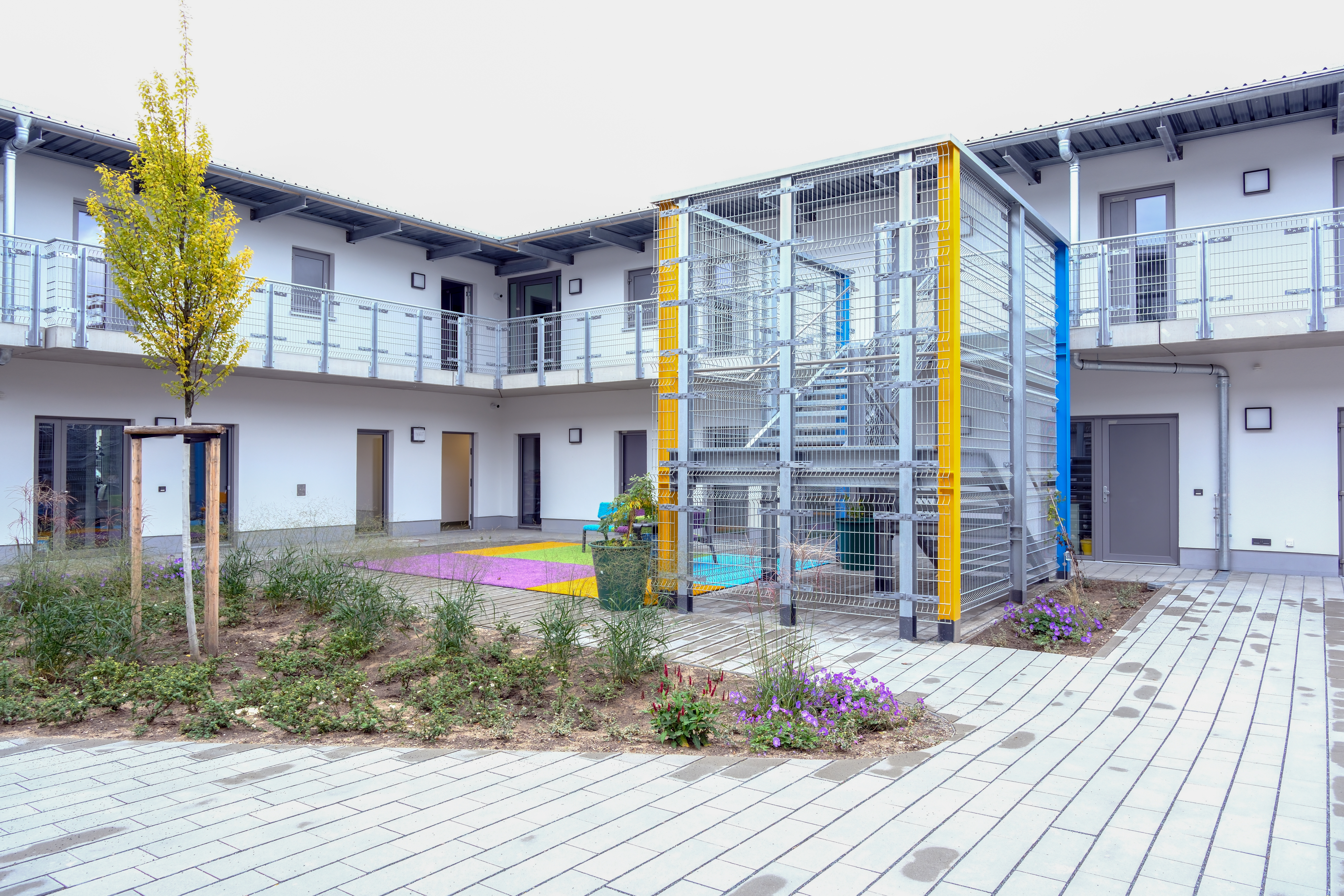 BeschreibungDas neue Obdachlosenheim in der Leyher Straße - Innenhof des Obdachlosenheims, Okt. 2025