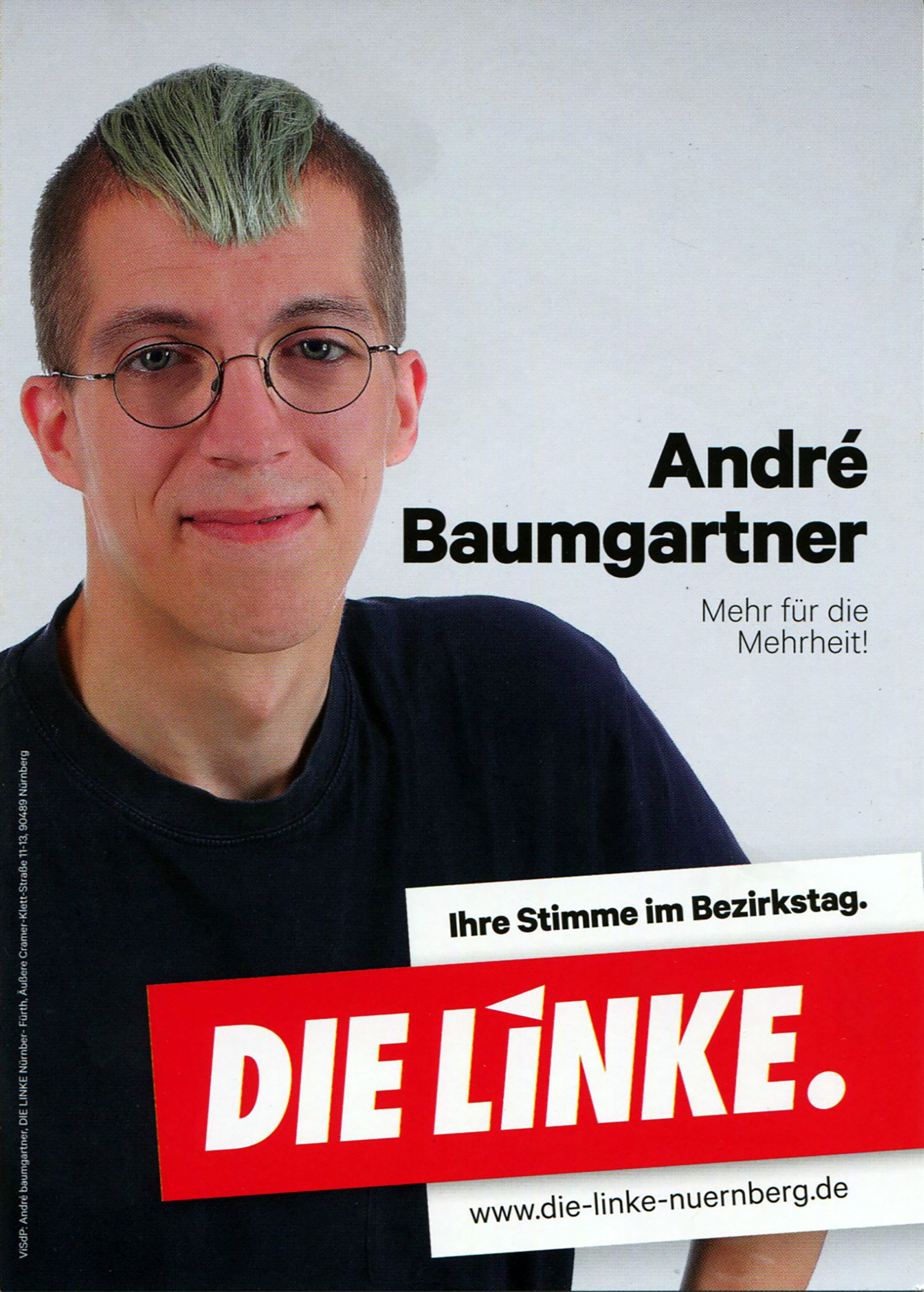 | Beschreibung | Linke-Wahlkampfflyer von Andre Baumgartner zur Bezirkstagswahl 2018 | ||