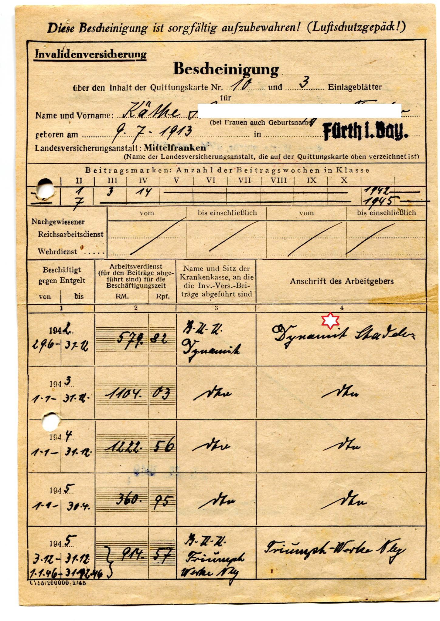 | Beschreibung | Jahresverdienstbescheinigung LVA Mittelfranken (Luftschutzgepäck!!) 1942-1945 mit Arbeitgeber "Dynamit Stadeln" | ||
