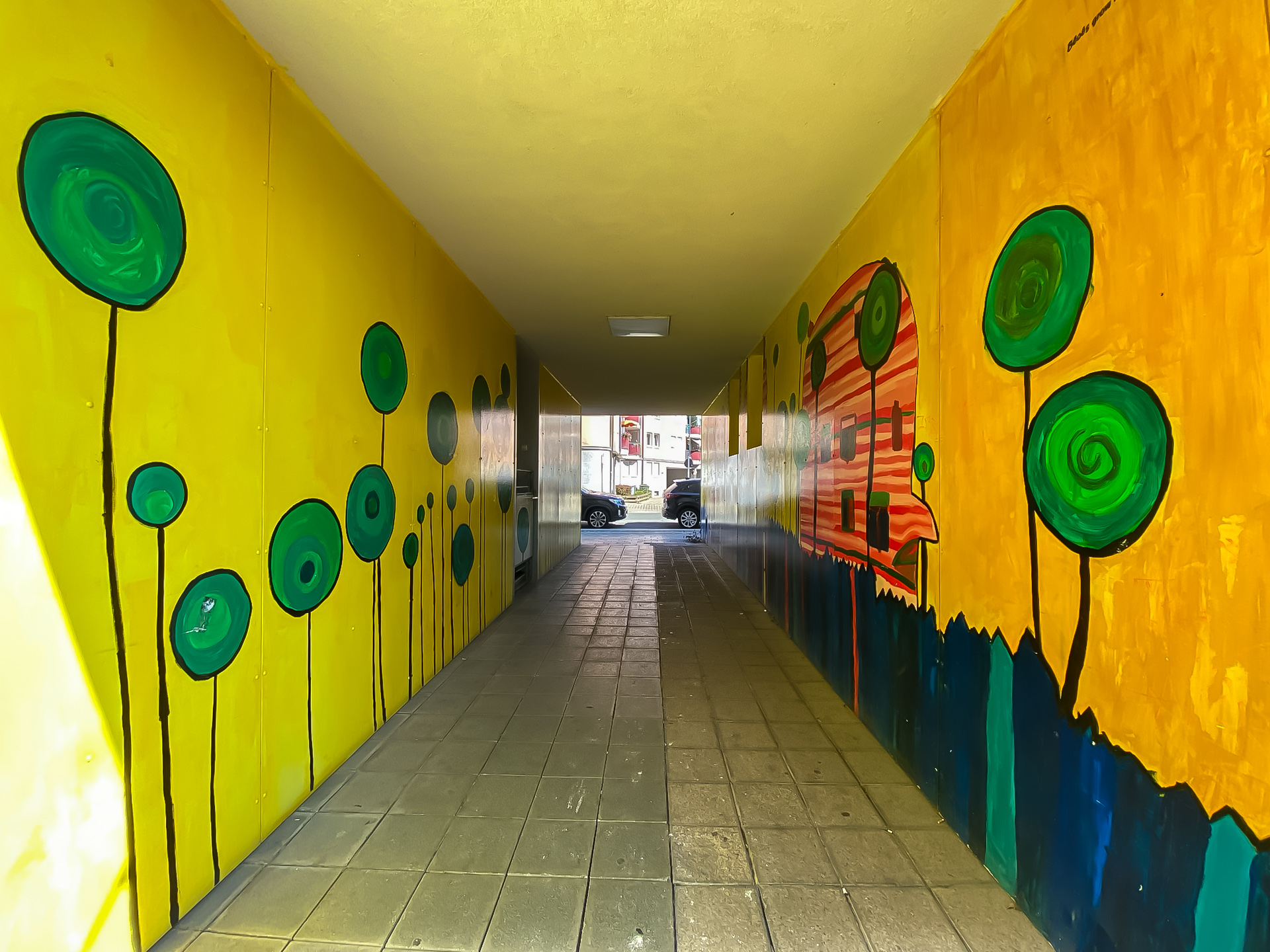 Mit Gafitti bemalter Durchgang des Anwesens Ludwigstraße 106