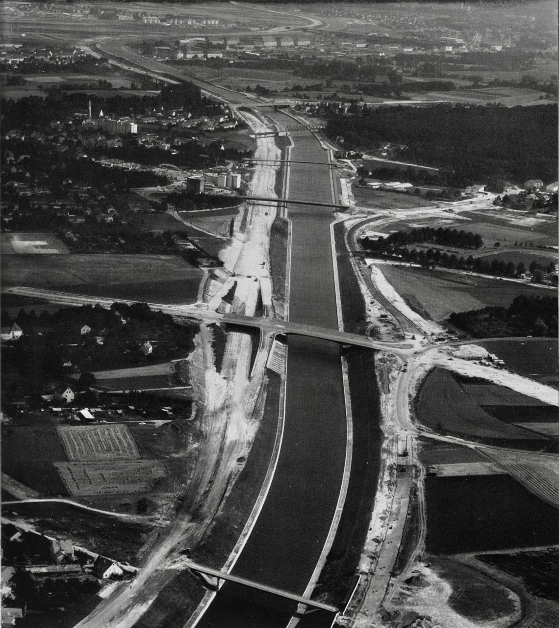 | Beschreibung | Main-Donau-Kanal - kurz nach Fertigstellung - mit im Bau befindlicher Südwesttangente und kreuzender Verkehrswege, Luftbild ca. 1972 | ||