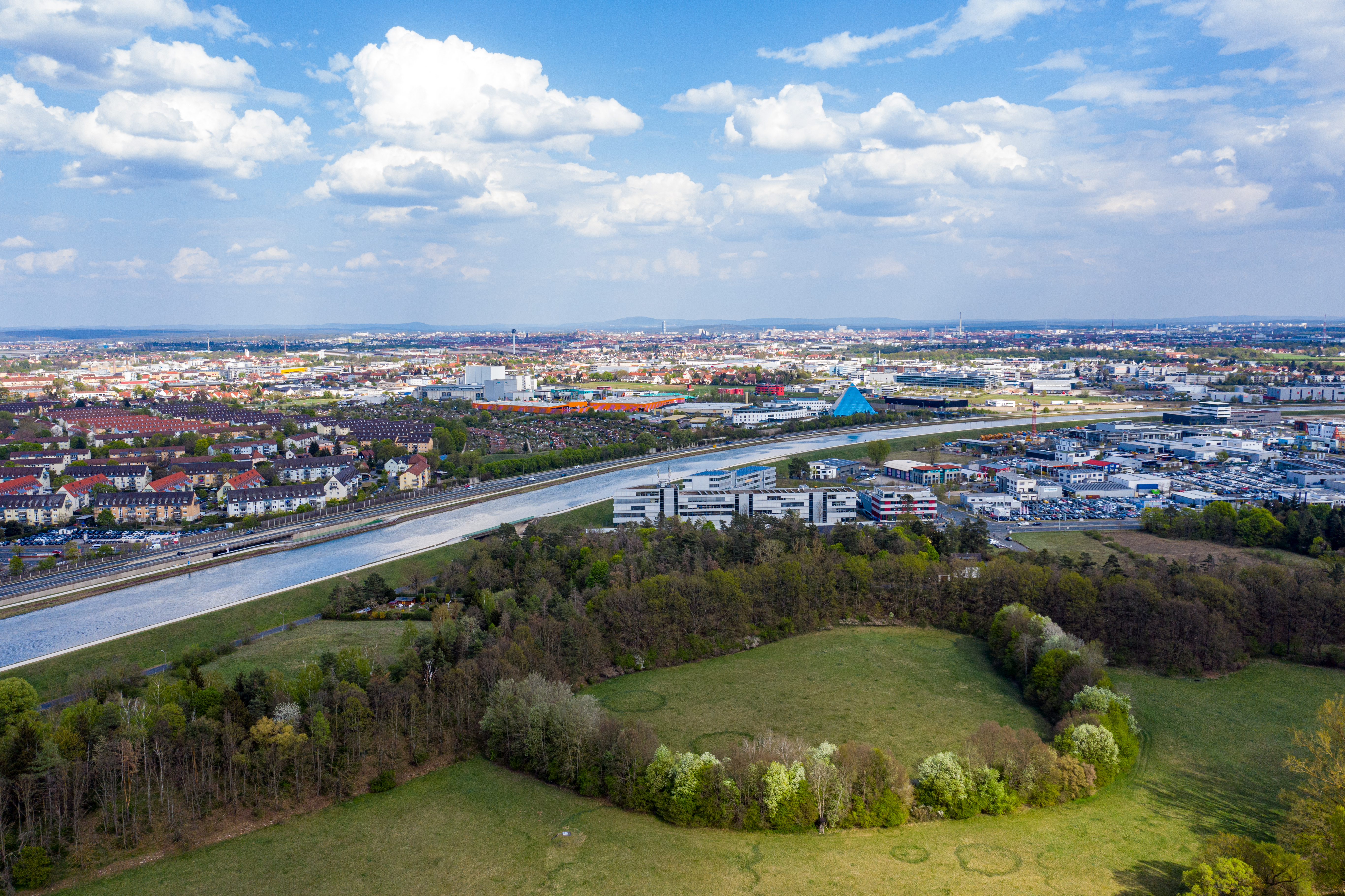 | Beschreibung | Blick über die Südstadt - hier mit Main-Donau-Kanal entlang der Südwesttangente - im Hintergrund die Unternehmen Complex, Wolf Butter Back und Schön Klinik Fürth Nürnberg, April 2020 | ||