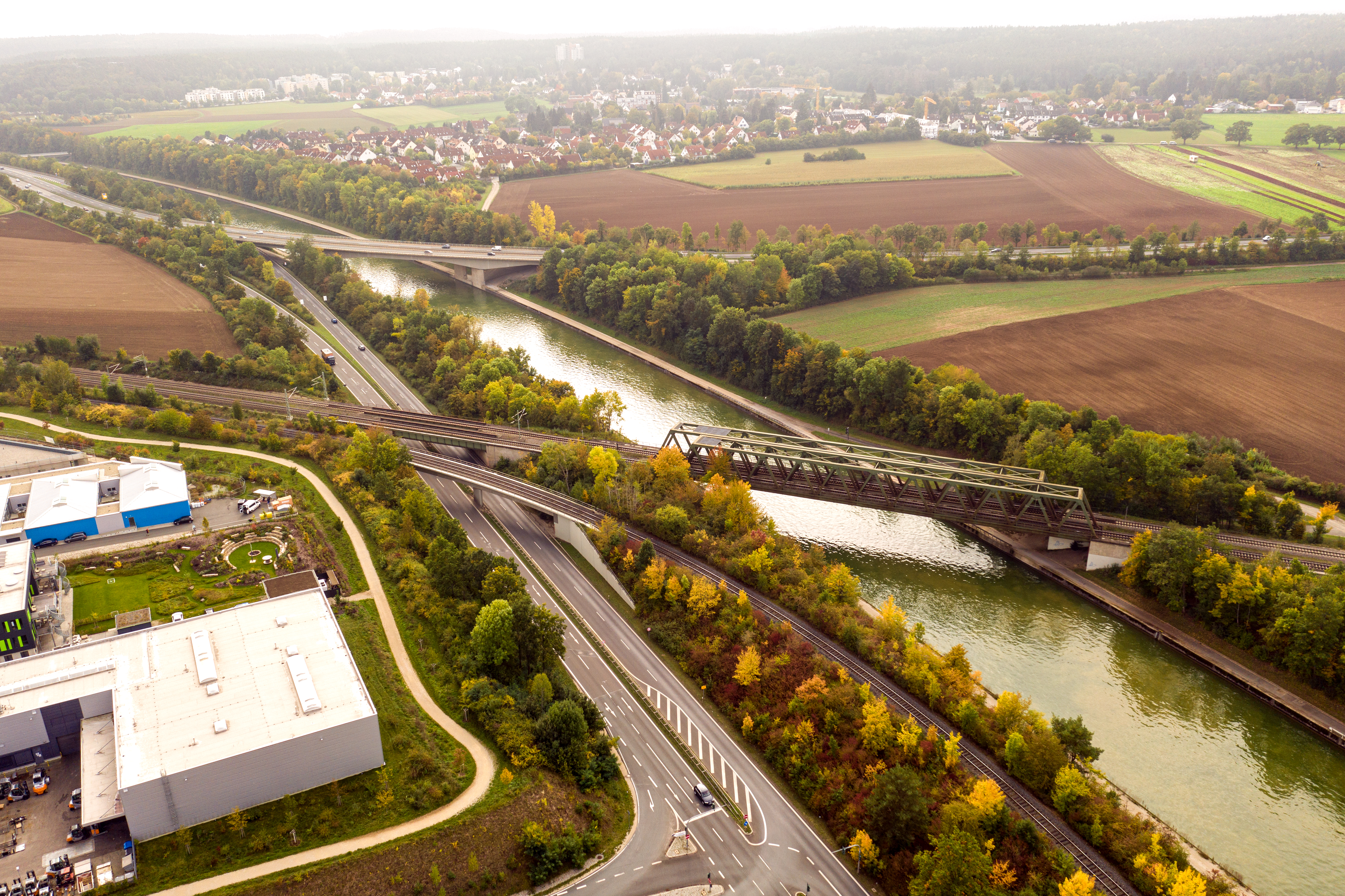 | Beschreibung | Blick über den Main-Donau-Kanal, im Vordergrund die Bahnbrücke Nürnberg-Würzburg, im Hintergrund die Theodor-Heuss-Brücke, Okt. 2020 | ||