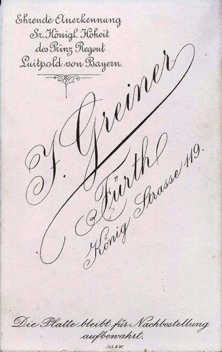| Beschreibung | Rückseite einer Fotografie aus dem Atelier J. Greiner in der Königstraße, ca. 1890 | ||