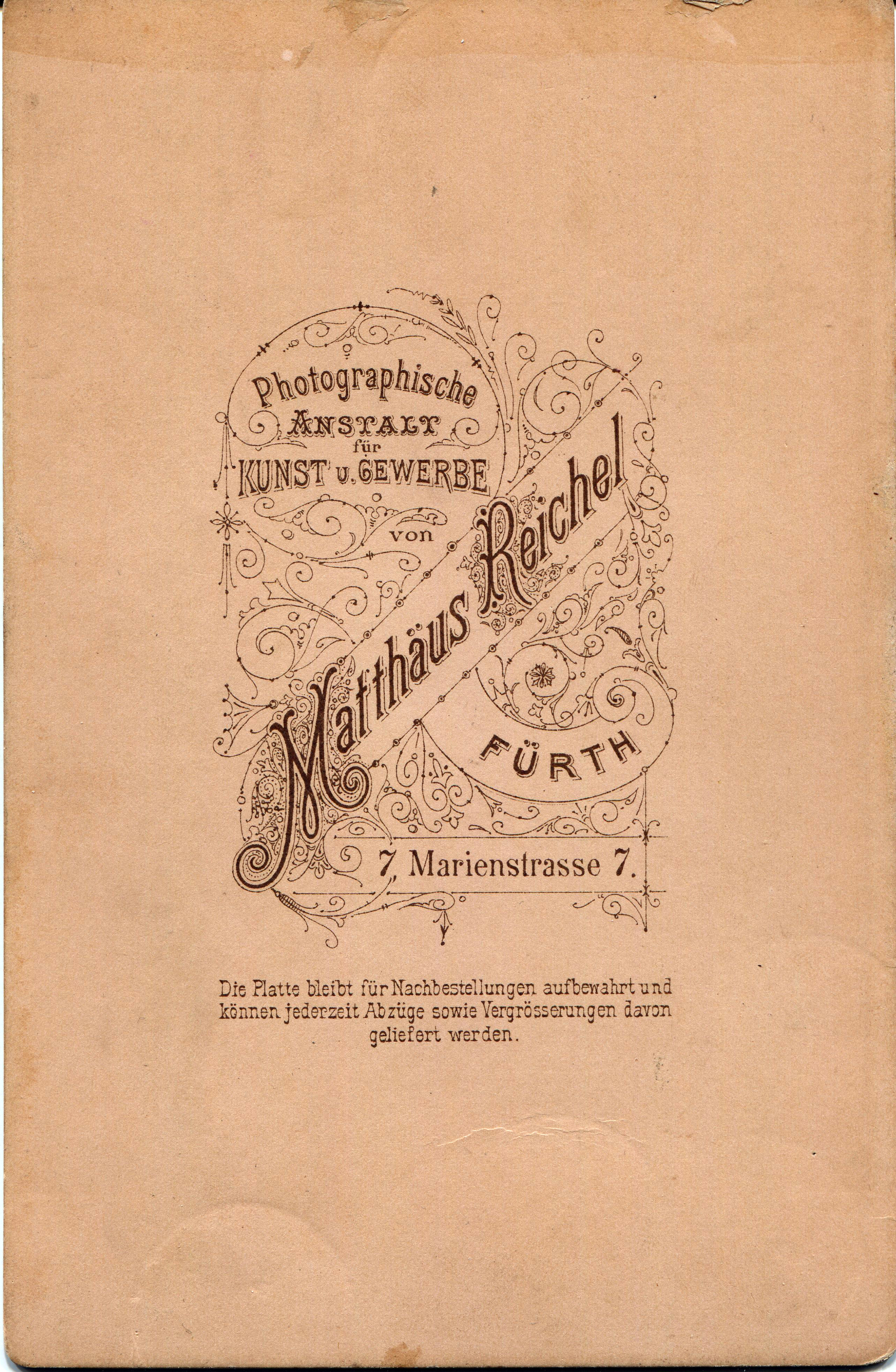 | Beschreibung | Rückseite einer Porträtaufnahme mit der Werbung von Matthäus Reichel, ca. 1890 | ||