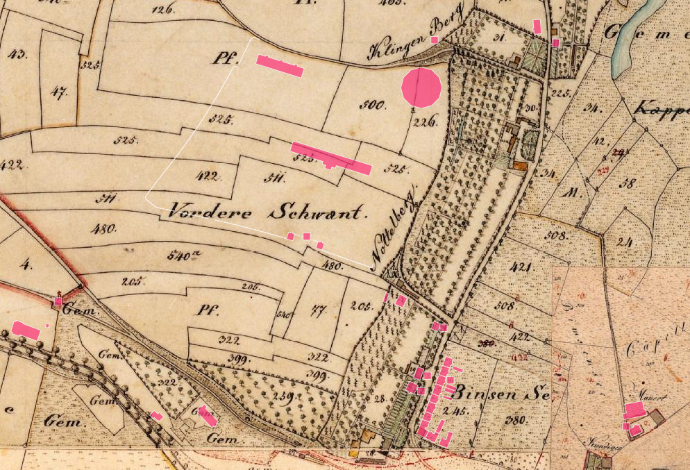 | Dateiinfo (Bild-Unterschrift und Info-Box, automatisch erstellt) | Karten von der Schwand, rote Markierung = Denkmäler im heutigen Bestand Lizenz: cc-by-sa-3.0 | ||