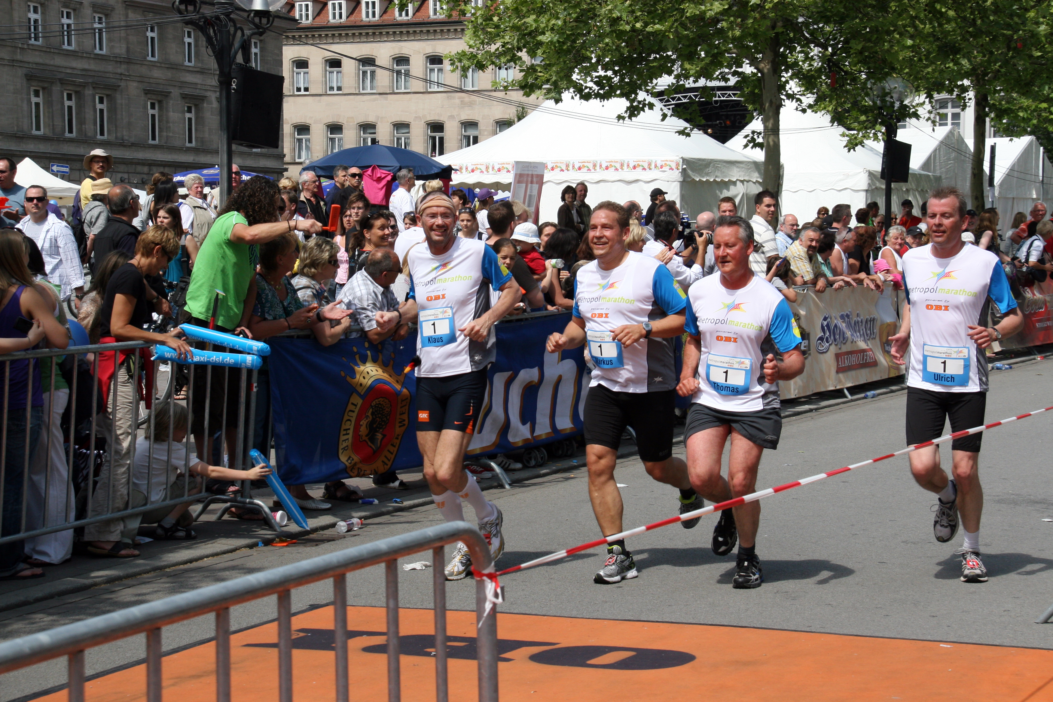 | Beschreibung | Zieleinlauf den Oberbürgermeistern Thomas Jung (Fürth) und Ulrich Maly (Nürnberg) am Metropolmarathon - mit dabei Bürgermeister Braun und ehem. GfK-Chef Klaus Wübbenhorst, Juni 2013 | ||