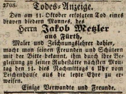 | Dateiinfo (Bild-Unterschrift und Info-Box, automatisch erstellt) | Todesanzeige von Jakob Metzler, Oktober 1839 Lizenz: noc-nc-1.0 | ||