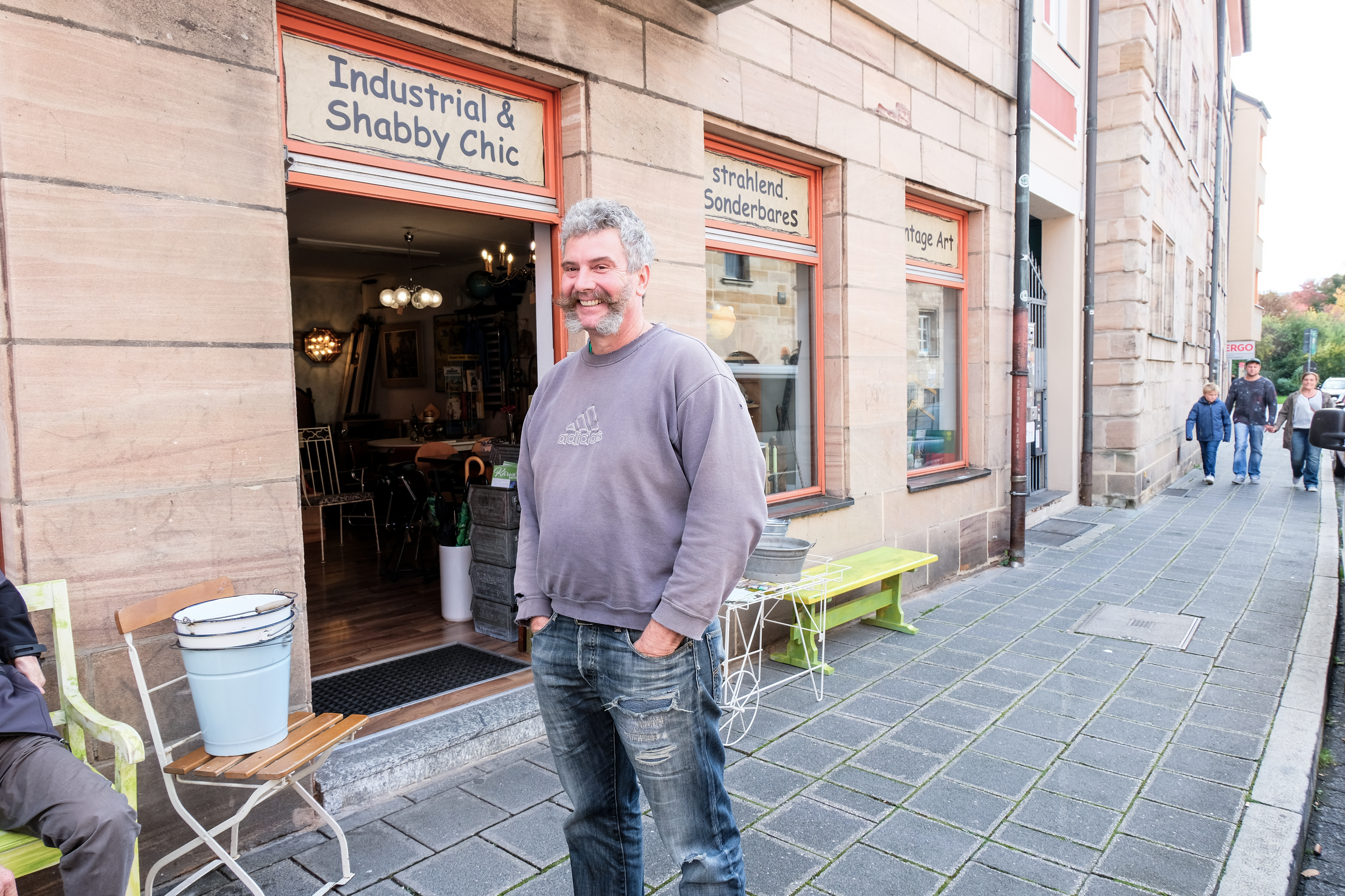 | Beschreibung | Micha Krauß vor seinem ehem. Geschäft Raum.StREBEN in der Königstraße, Okt 2017 | ||