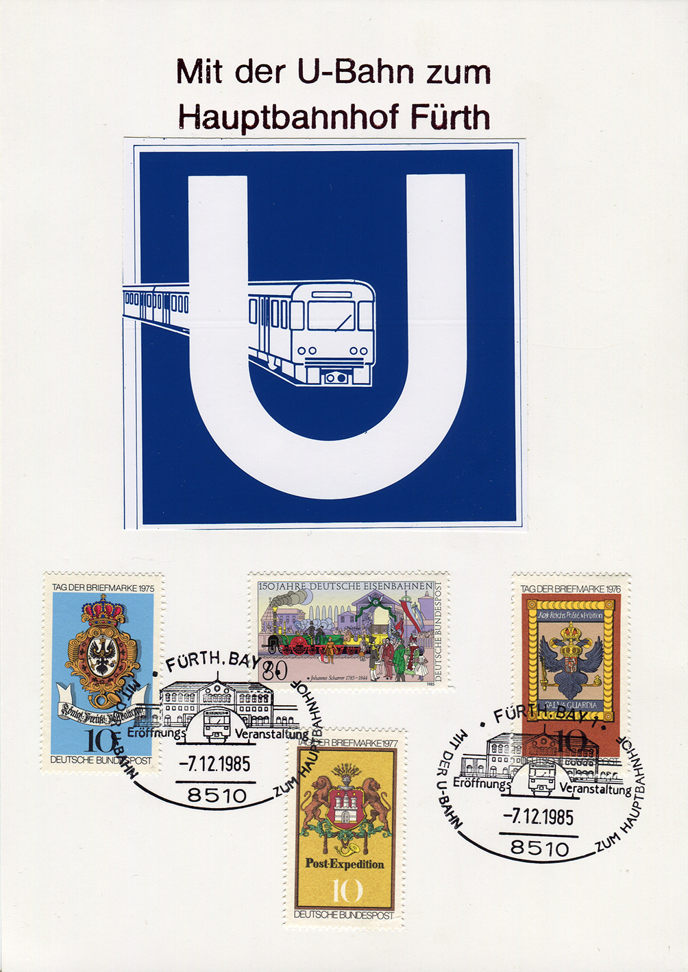 | Beschreibung | Briefmarken-Sonderblatt mit Stempel zur U-Bahnhof-Eröffnung Hauptbahnhof am 7. Dezember 1985 | ||