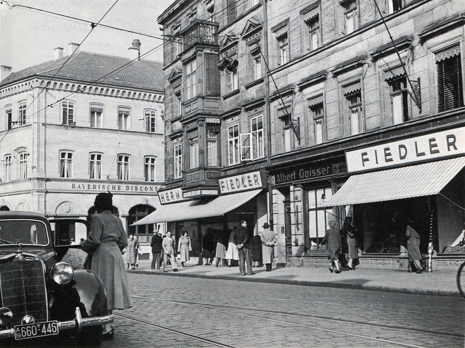 | Beschreibung | Modehaus Fiedler - im Hintergrund die ehem. Commerzbank, ca. 1950 | ||