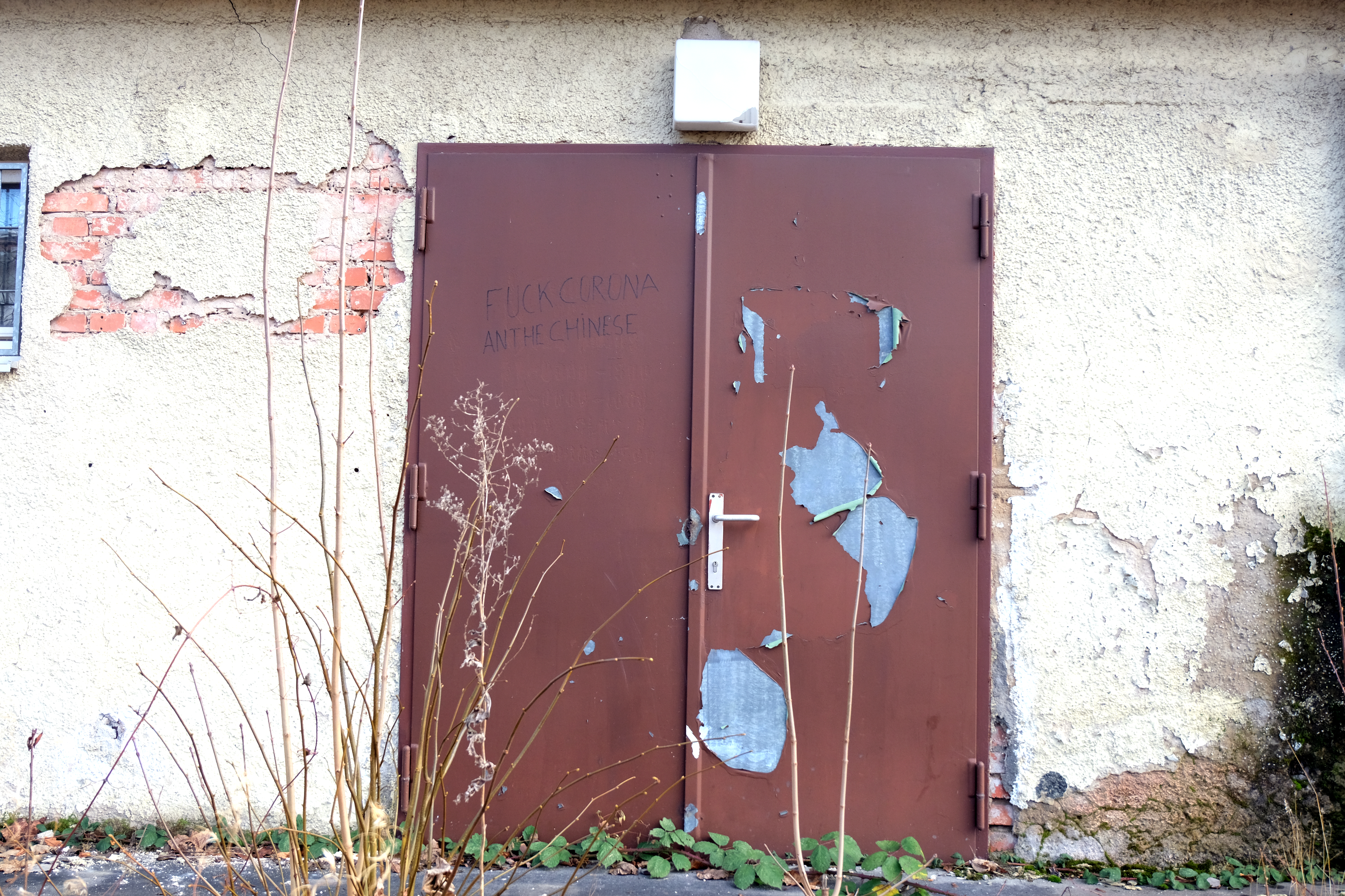 | Beschreibung | Lagerhäuser der ehem. U.S. Army-Truppen auf dem Gelände der ehem. Monteith Barracks - mit einer Beschriftung zu einem aktuellen Bezug: "Fuck Corona and the Chinese", Jan. 2021 | ||