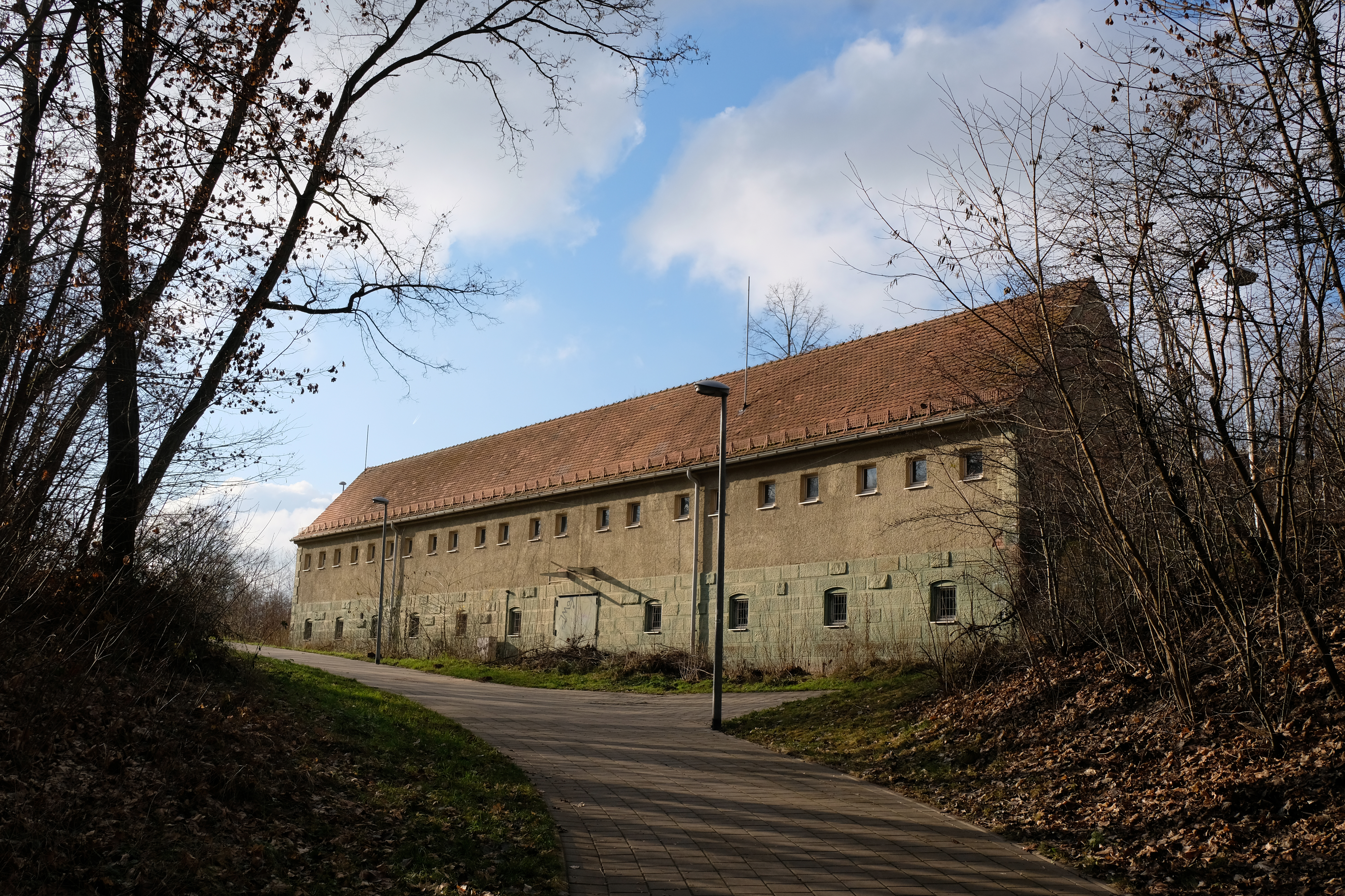 | Beschreibung | Lagerhäuser der ehem. U.S. Army-Truppen auf dem Gelände der ehem. Monteith Barracks, Jan. 2021 | ||