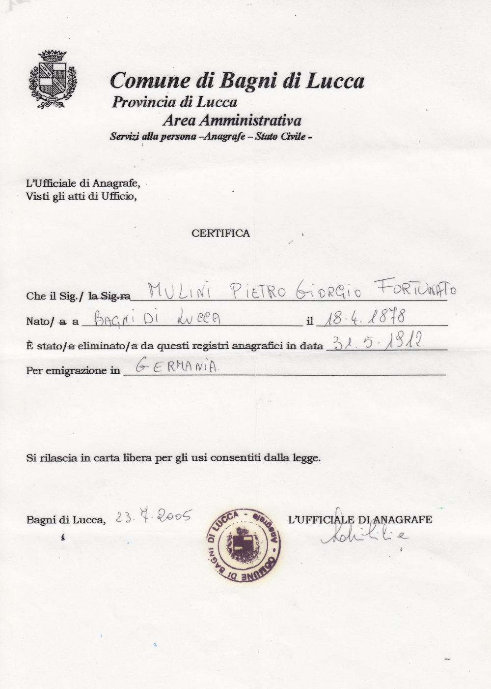 | Dateiinfo (Bild-Unterschrift und Info-Box, automatisch erstellt) | Nachweis über Mulinis Abmeldung in Bagni di Lucca, aus Italien angefordert vom Urenkel im Jahr 2005 Urheber: Famlilie Mulini<br>Erstellungsdatum: 23. Juli 2005<br>Lizenz: cc-by-sa-3.0 | ||