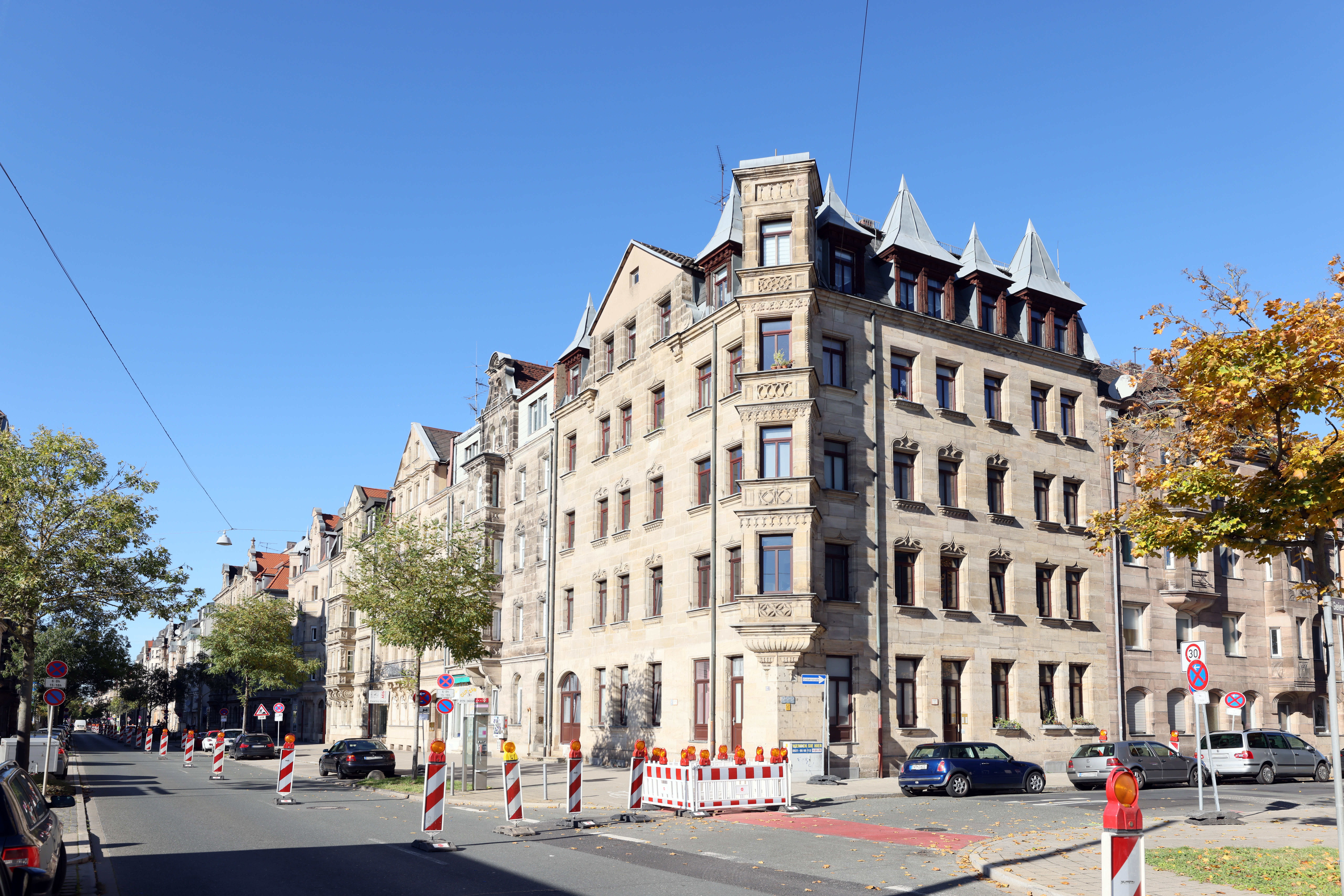 | Beschreibung | Blick in die Nürnberger Straße von Ost nach West - rechts im Bild Nürnberger Straße 121, Okt. 2021 | ||