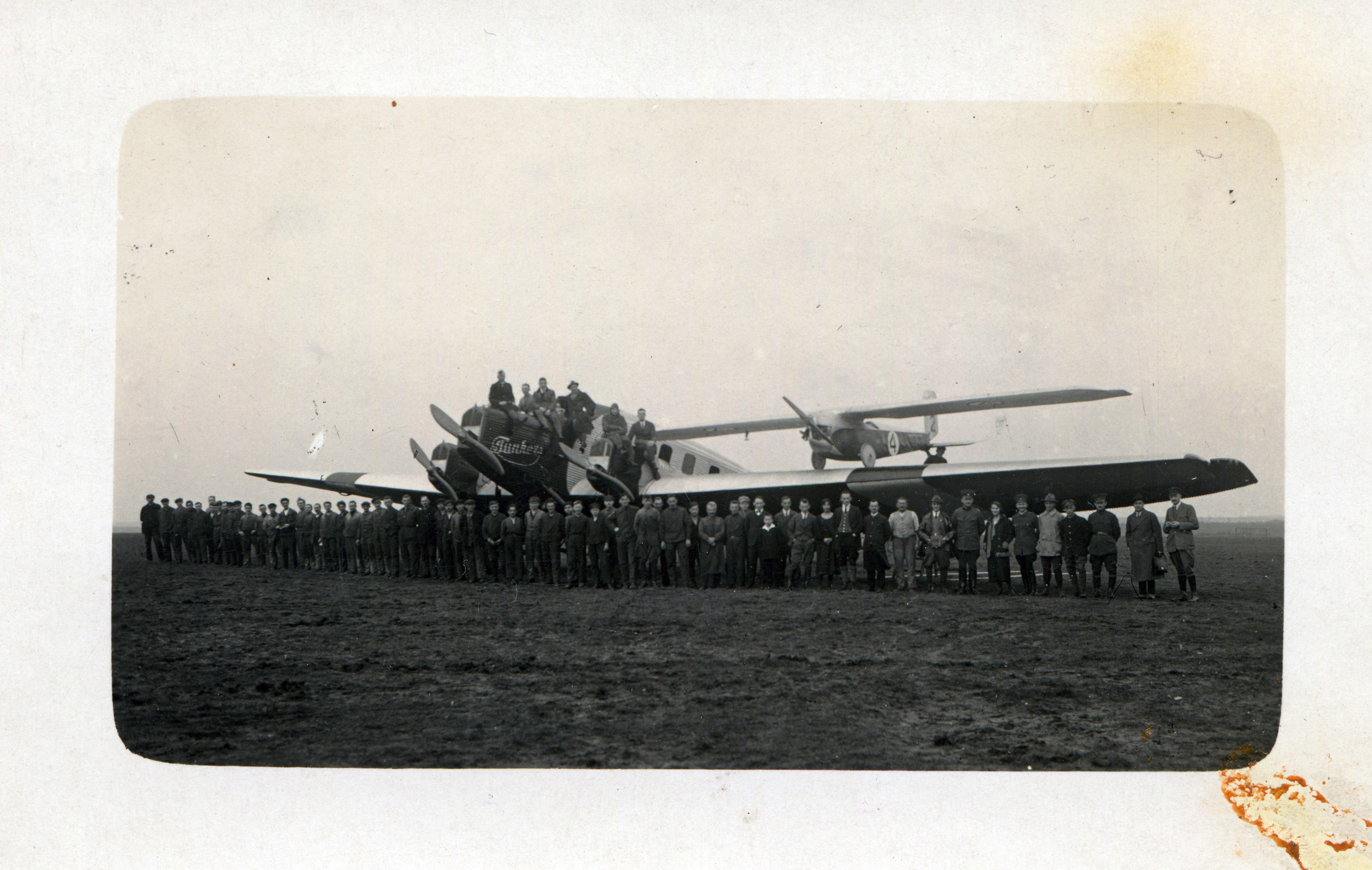 Ergänzung: "Die Flugzeugführer Peter Wagner, Rudolf Krause, Hermann Röder, Otto Brauer u. unbekannt. Das Kleinflugzeug der Akaflieg Darmstadt, Flugzeugführer Botsch auf dem Flügel der ersten Junkers G 23 in Fürth" (online)