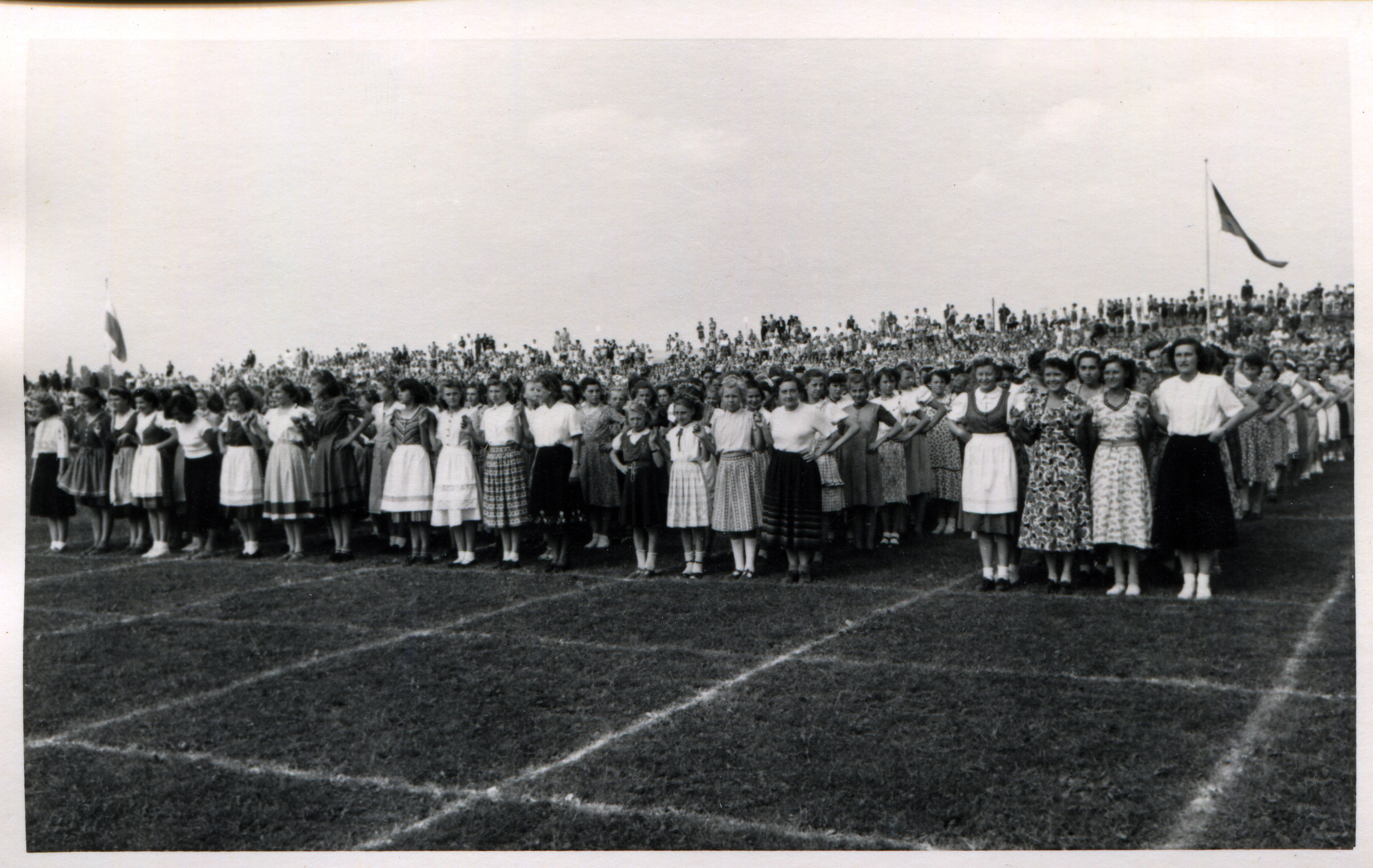 | Beschreibung | Hedwig Steinhäuser (rechts im Bild mit weißer Bluse) bei einer Veranstaltung, ca. 1950 | ||
