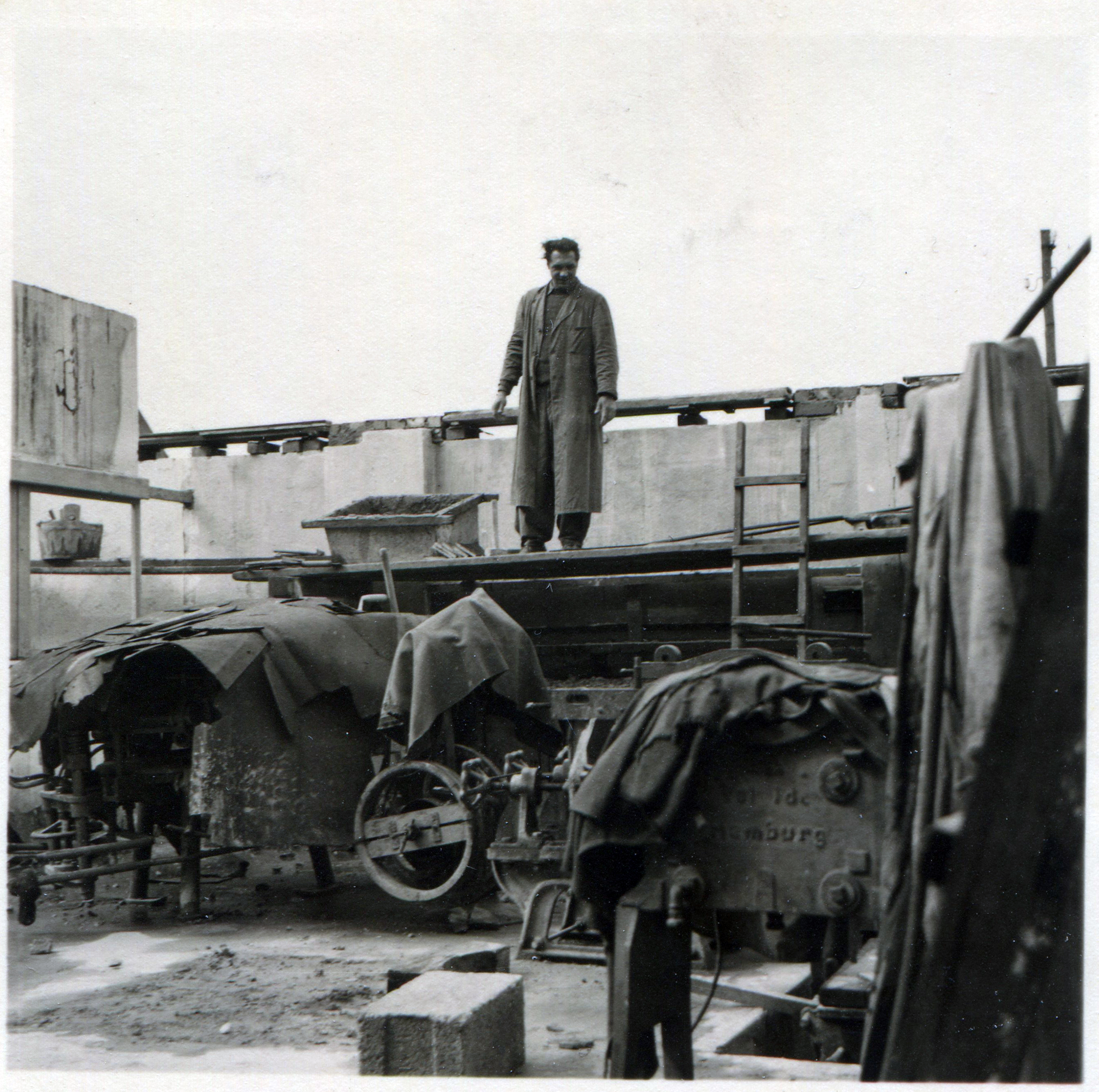 | Beschreibung | Geräte und Maschinen der Firma Reifen-Reichel in der Langen Straße, zugedeckt und geschützt bei den Abrissarbeiten – auf dem Baugerüst der Betriebseigentümer Michael Reichel, 1953 | ||