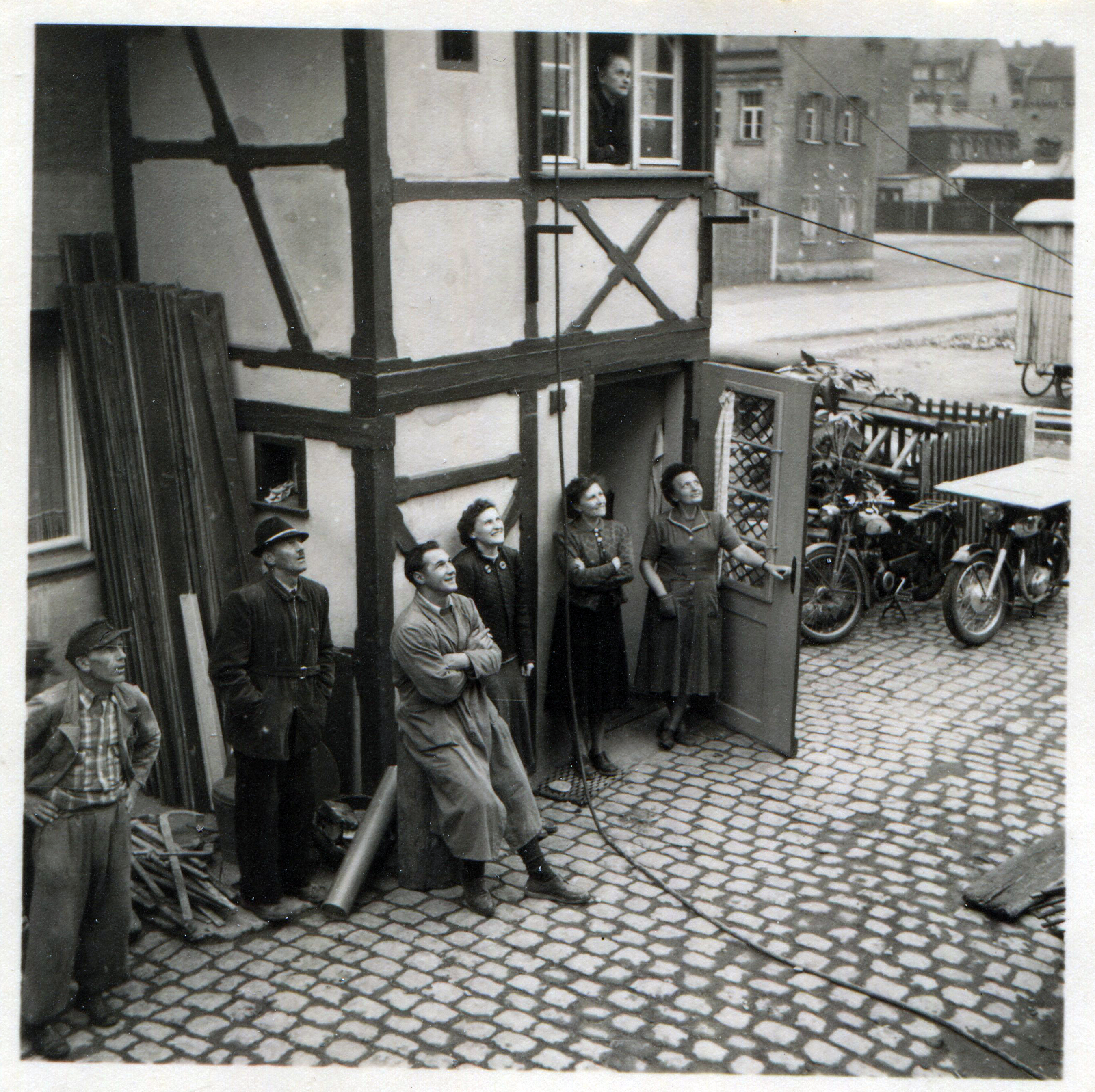 | Beschreibung | Richtfest am Reifen-Reichel in der Langen Straße für den Neubau Lange Straße 67 a, 1953 | ||