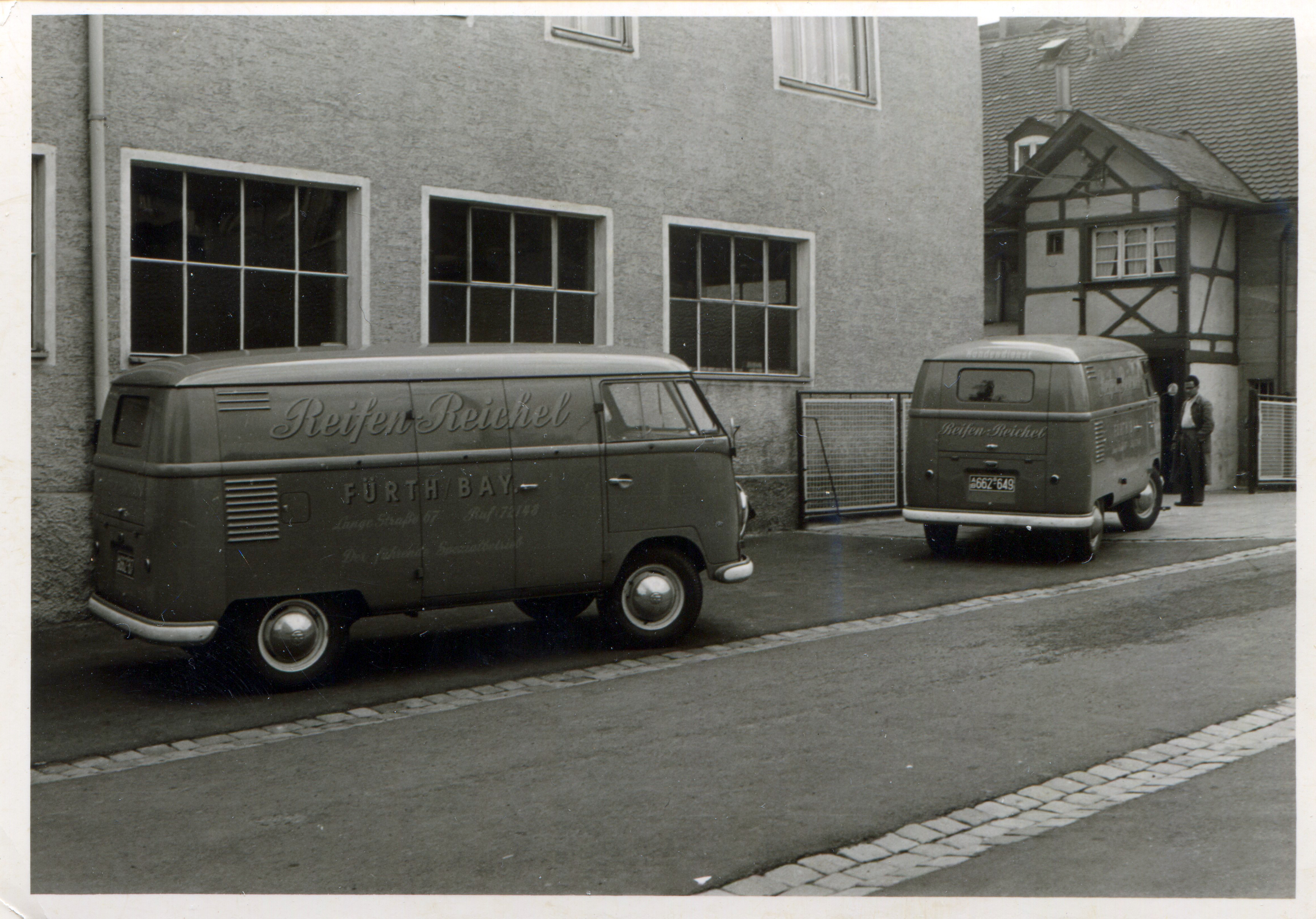 | Beschreibung | Firmenfahrzeuge (VW T1) von Reifen-Reichel in der Langen Straße, 1955 | ||