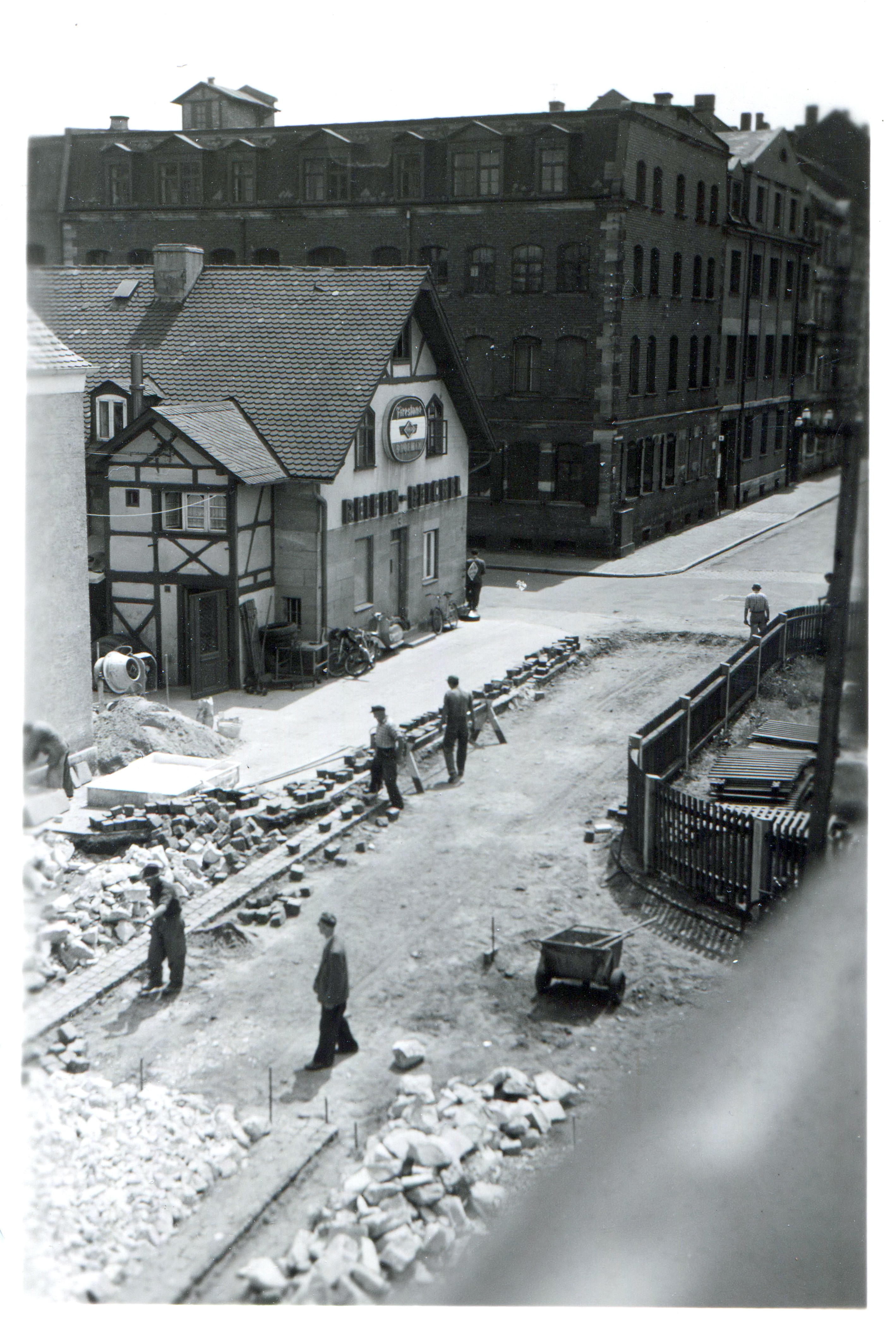 | Beschreibung | Reifen-Reichel in der Langen Straße - im Hintergrund das Gebäude Finkenstraße 6 d, 1955 | ||