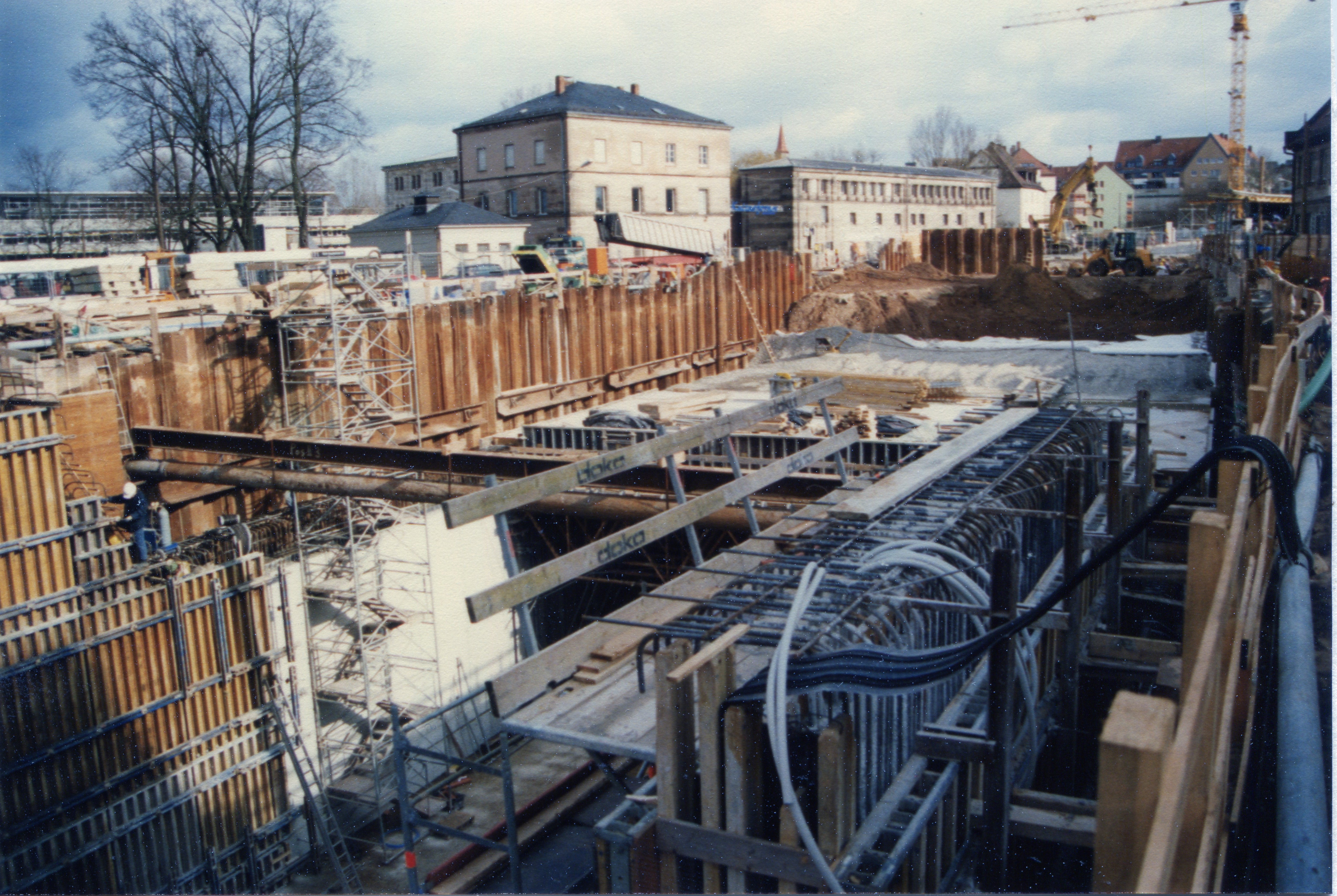 | Beschreibung | Tiefbauarbeiten für den U-Bahnhof Stadthalle vor dem Kulturforum im Februar 1997 | ||