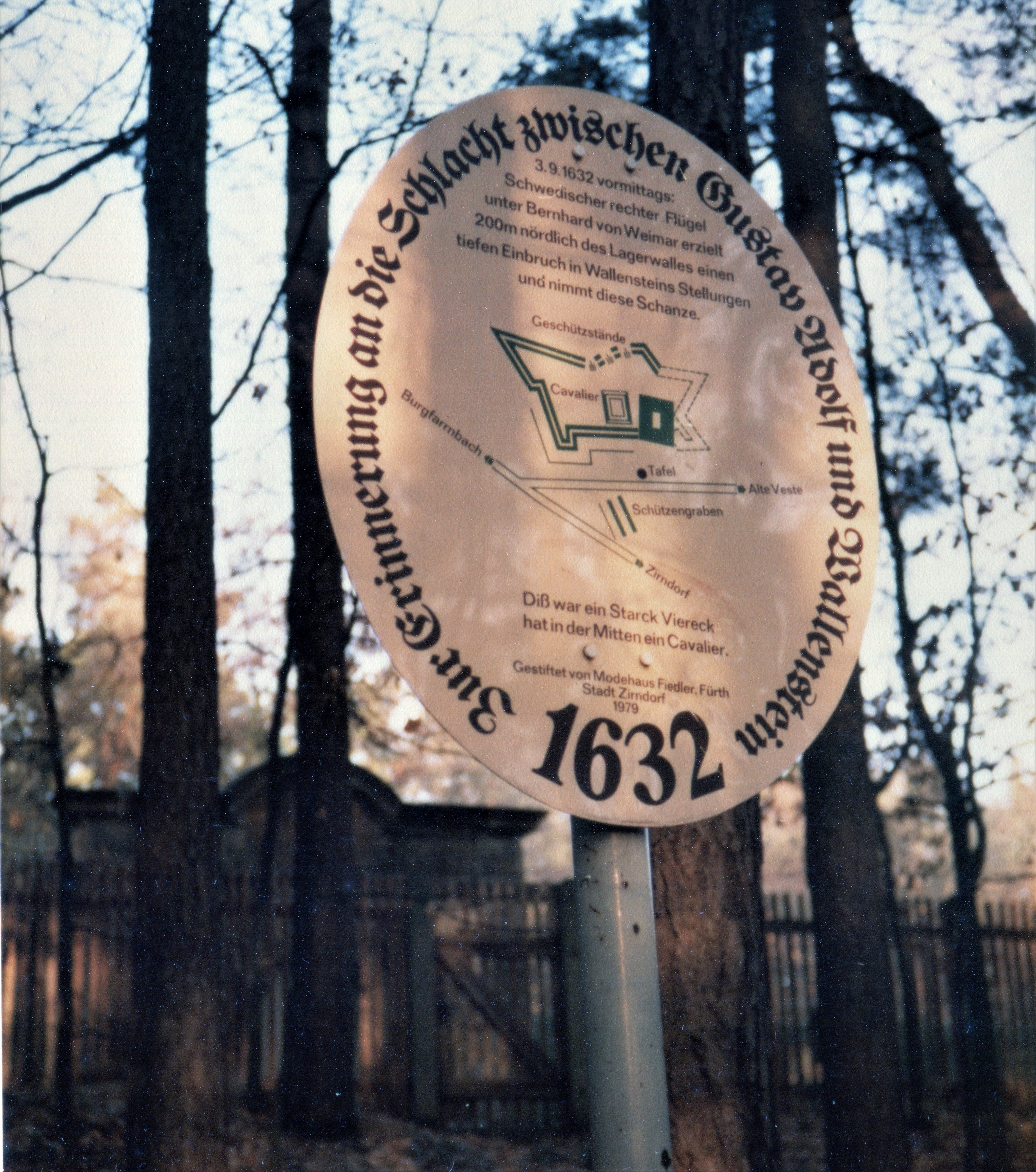 | Dateiinfo (Bild-Unterschrift und Info-Box, automatisch erstellt) | Gedenktafel zur Schlacht an der Alten Veste 1632, im Hintergrund der Zirndorfer Hochbehälter - ... Gedenktafel zur Schlacht an der Alten Veste 1632, im Hintergrund der Zirndorfer Hochbehälter - Aufnahme von 1979 - gestiftet vom Modehaus Fiedler<br>Urheber: Klaus-Peter Schaack<br>Erstellungsdatum: 1. November 1979<br>Lizenz: cc-by-sa-3.0 | ||