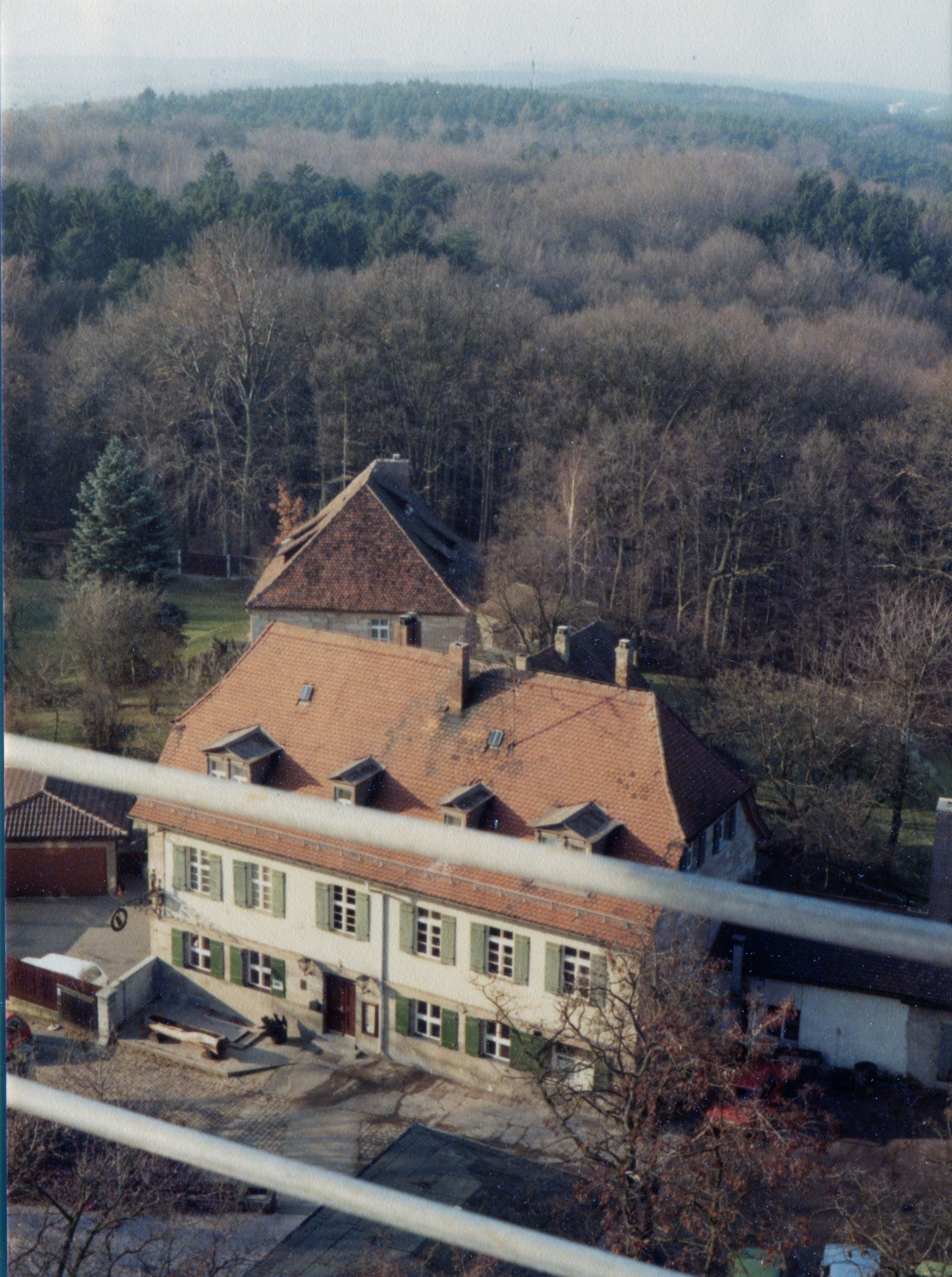 | Beschreibung | Ausblick vom Turm Alte Veste (Rohbau) – Aufnahme 10. Nov. 1979, Fertigstellung 1980 – auf das Gasthaus "Alte Veste" | ||