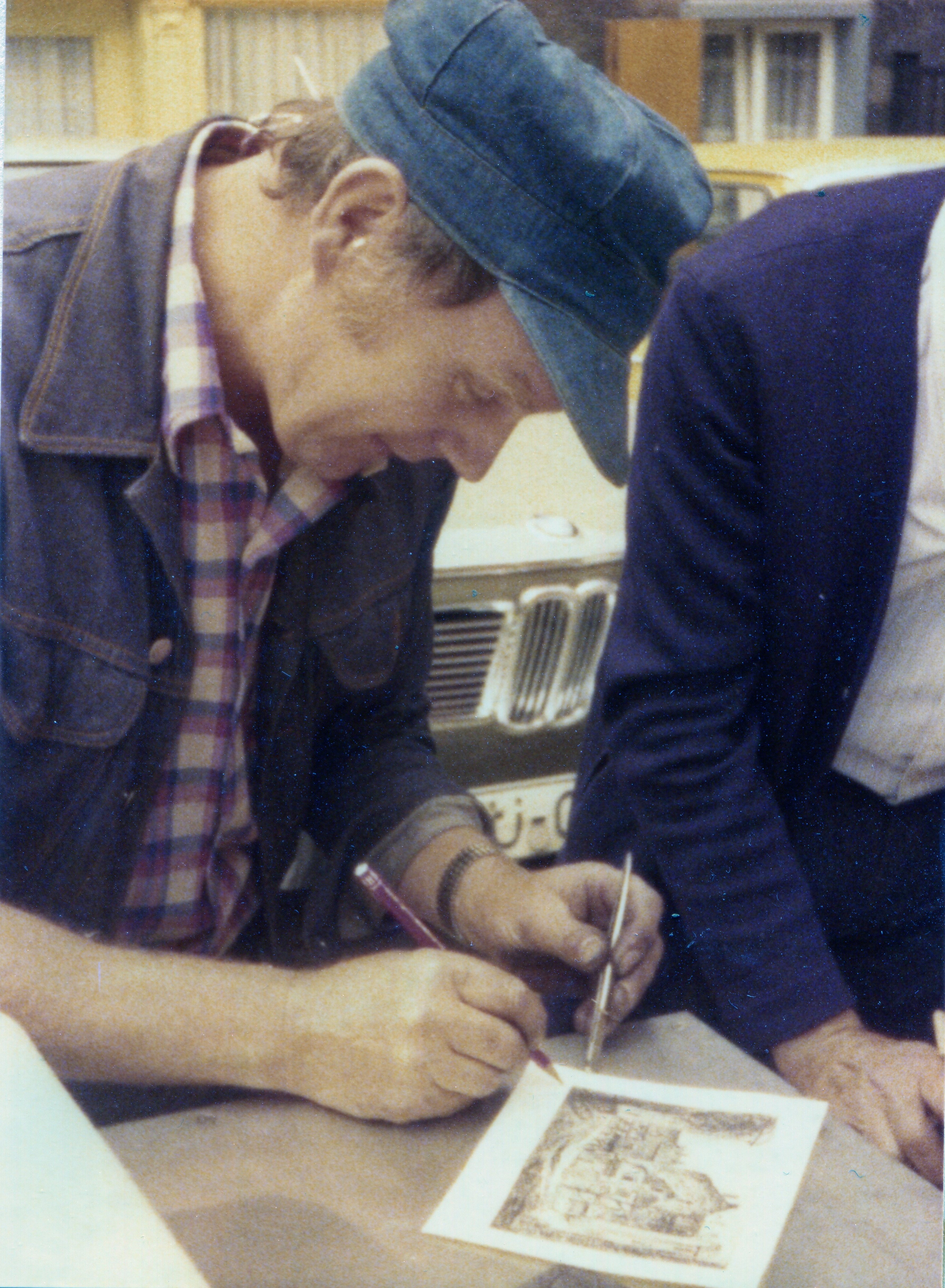 | Beschreibung | Am Fürther Grafflmarkt 1977 stellten die Künstler Fritz Lang (s. Abbildung) und Friedemann Streit diverse Arbeiten live und persönlich her | ||