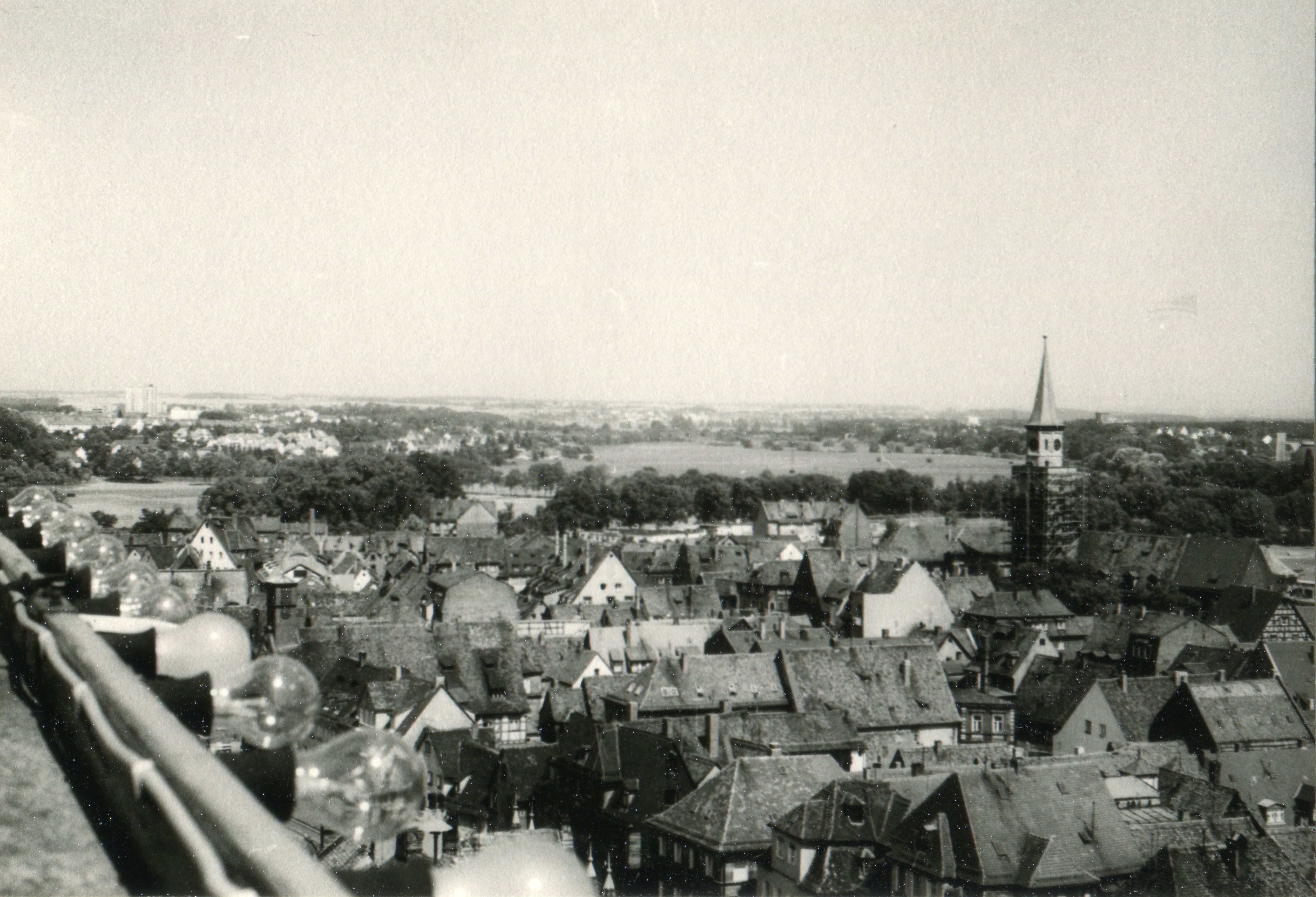 VHS Rundgang mit Rathausturmbesteigung am 28.6.1976. Blick nach Nord/Osten über die Dächerlandschaft zwischen Königstraße gegenüber dem Rathaus, dem Marktplatz mit dem Ämterhaus Gustavstraße 65 Bildmitte und die Gustavstraße mit der eingerüsteten Kirche St. Michael. Über dem Wiesengrund links die Schwand mit dem Hochhaus Albrecht-Dürer-Straße 3, rechts hinten Stadeln.