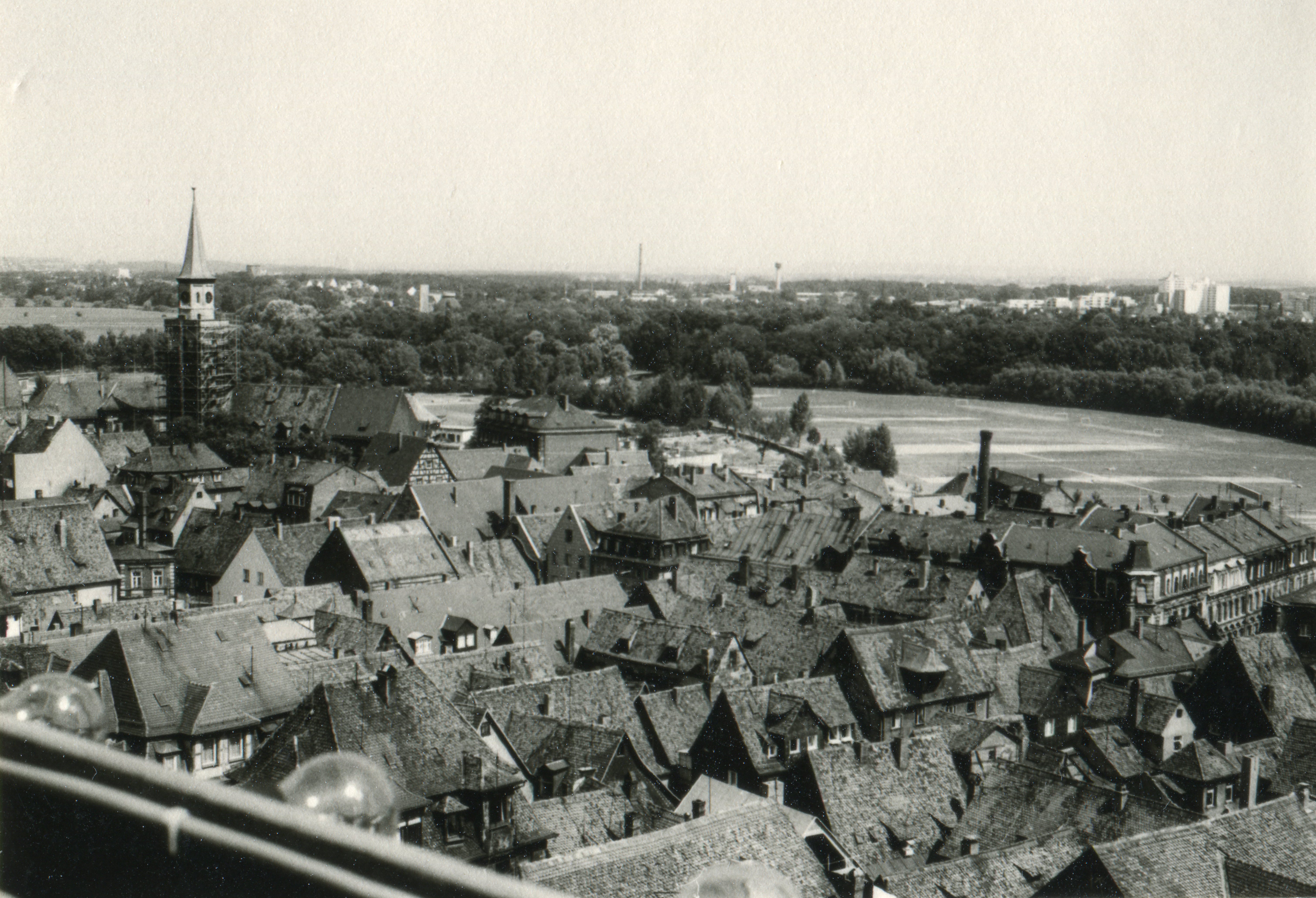 VHS Rundgang mit Rathausturmbesteigung am 28.6.1976. Blick nach Nord/Osten über die Dächerlandschaft zwischen Königstraße gegenüber dem Rathaus bis zur Gustavstraße. Rechts davon großes Eckgebäude Gustavstraße 12 mit Häuserzeile Baldstraße. Links Kamin Gustavstraße 16/18 und die eingerüstete Kirche St. Michael, Gebäude daneben Grundschule Kirchenplatz. Über den Wiesengrund rechts die Hochhäuser am Prater, Bildmitte Fabrikanlage der Dynamit-Nobel in Stadeln.
