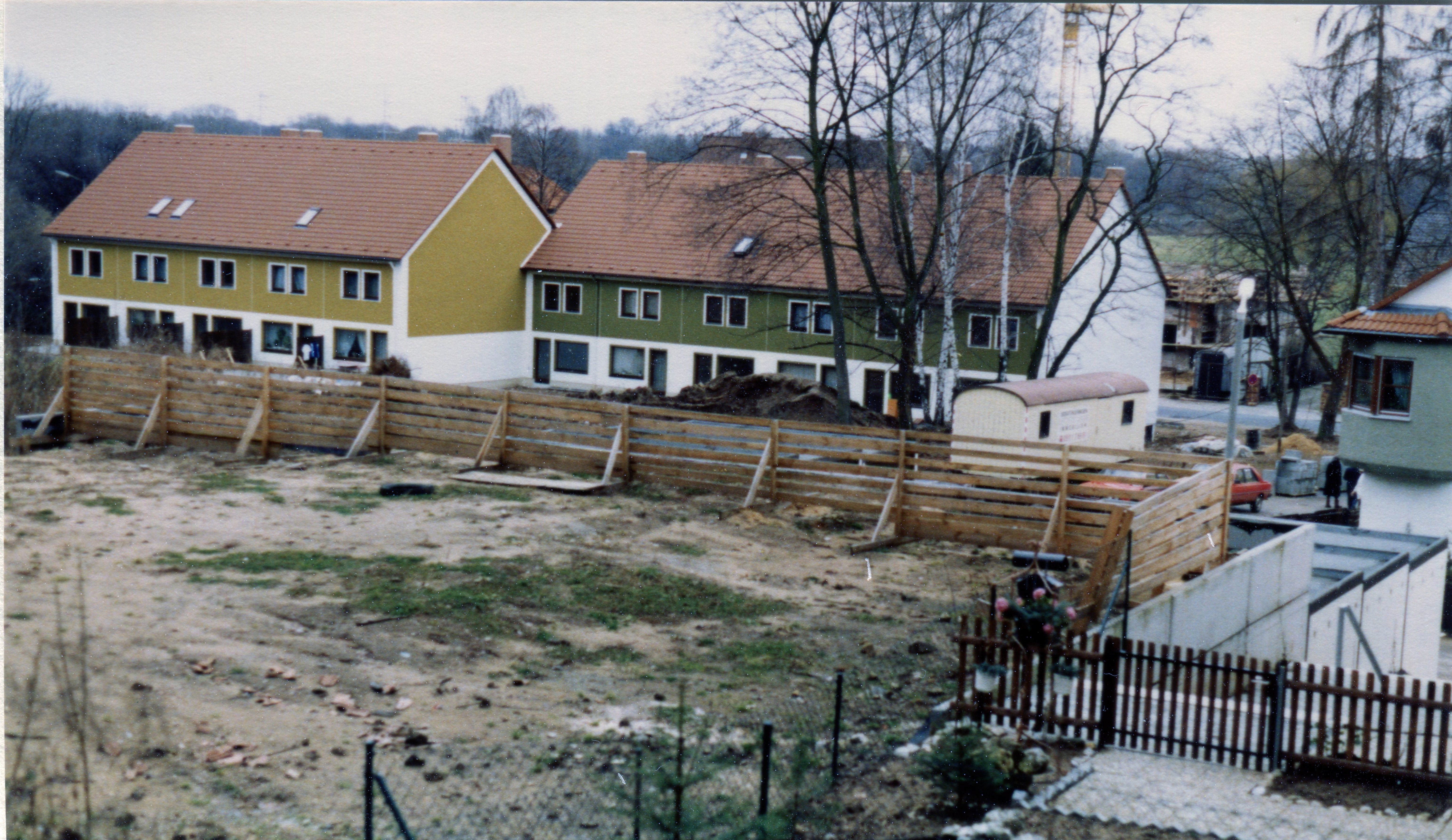 | Beschreibung | Baumaßnahmen im ehem. Grüner Park im Februar 1988. In der Mitte fertige Stadthäuser an der Vacher Straße. | ||