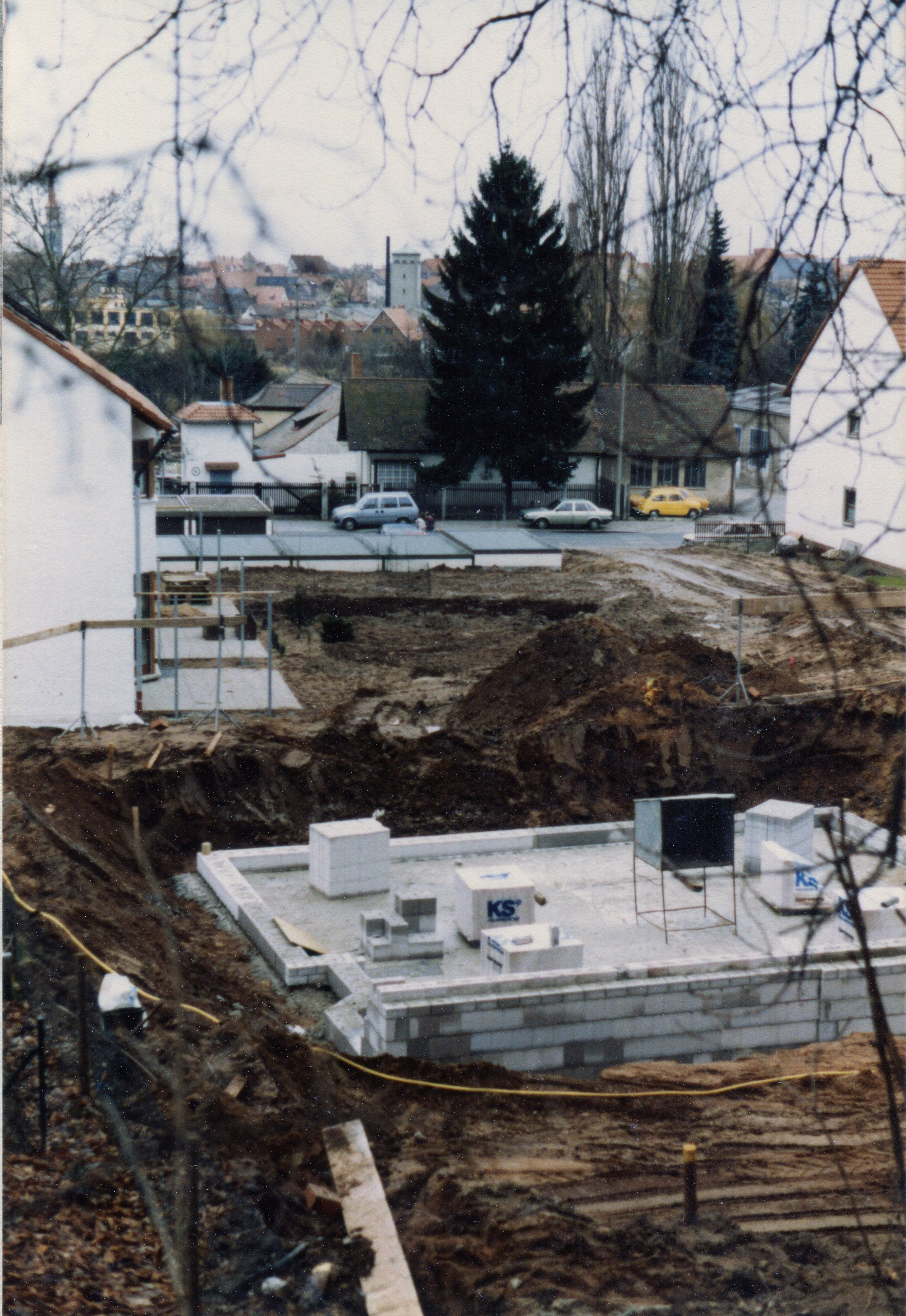 | Beschreibung | Baumaßnahmen im ehem. Grüner Park im Februar 1988. Bildmitte die Vacher Straße. | ||