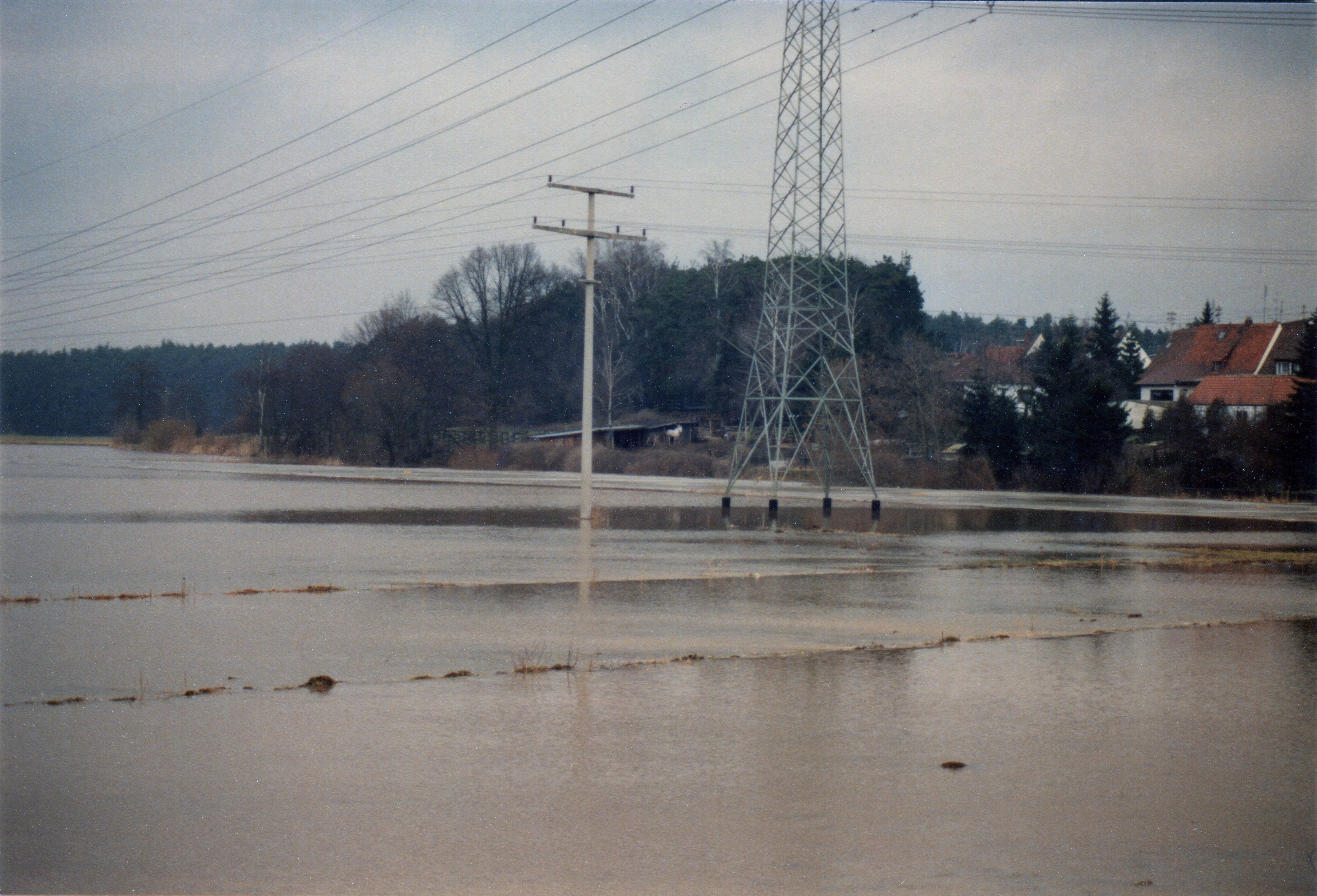 | Beschreibung | Hochwasser bei Vach, Blick in den überschwemmten Wiesengrund im Hintergrund Mannhof, Feb. 1987 | ||