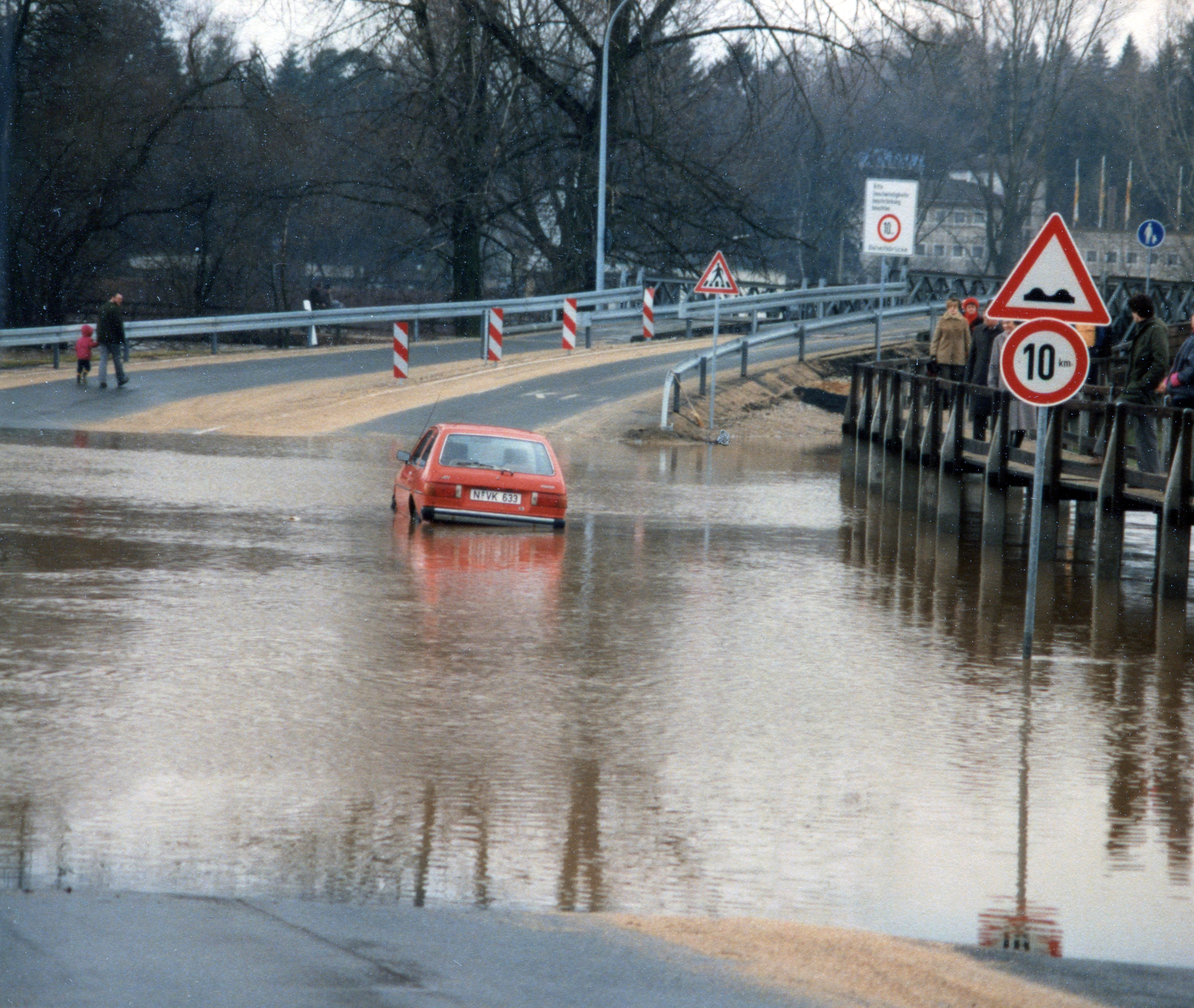 | Beschreibung | Hochwasser am Dambacher Talübergang "Fuchsloch" mit mutigen Autofahrern und Fußgänger Hochwassersteg, Feb. 1987 | ||
