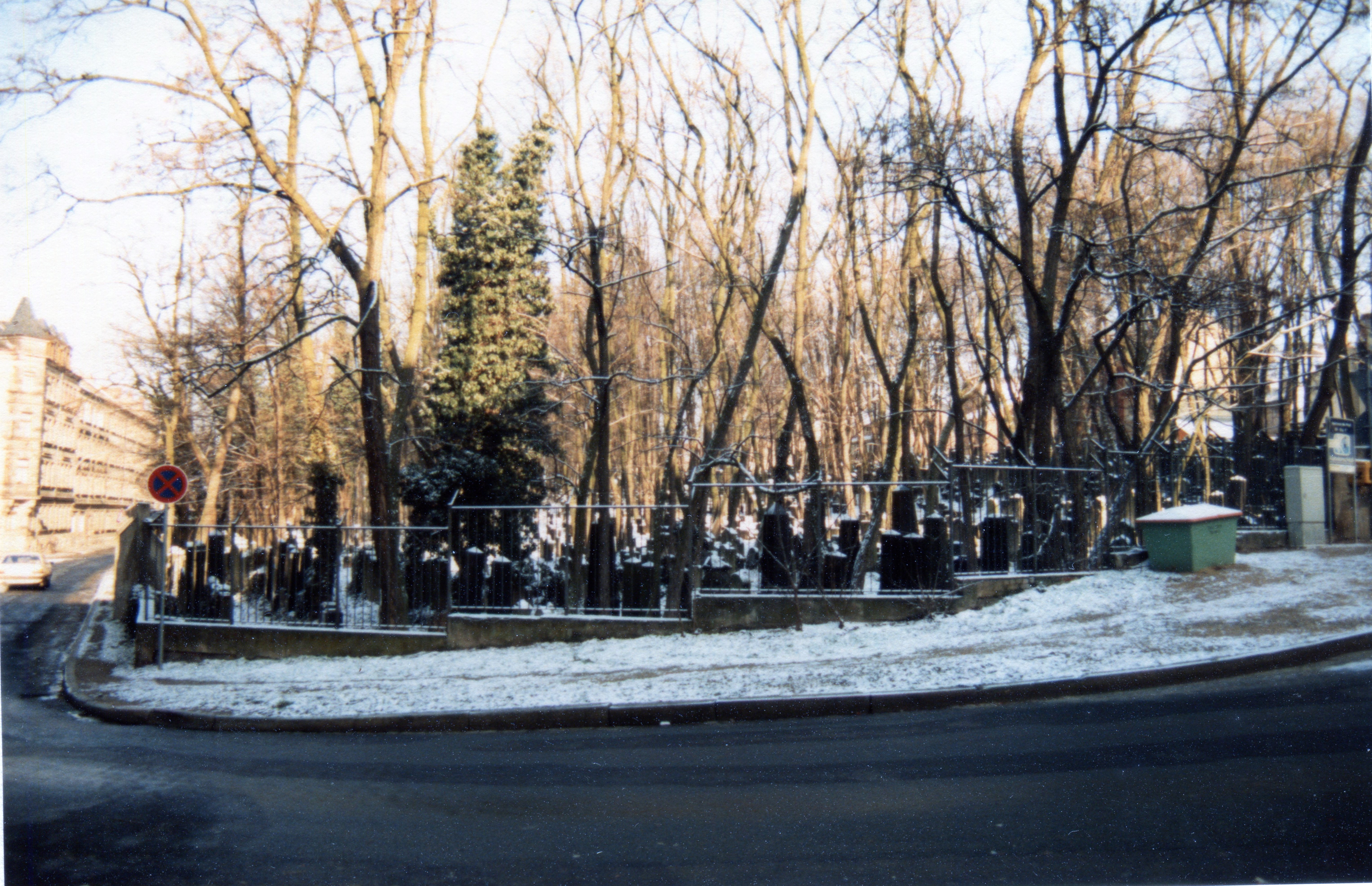 | Beschreibung | Alter Jüdischer Friedhof Bogenstraße Einmündung Weiherstraße links mit Häuserzeile Weiherstraße 6 und 7, Aufnahme Januar 1987 | ||