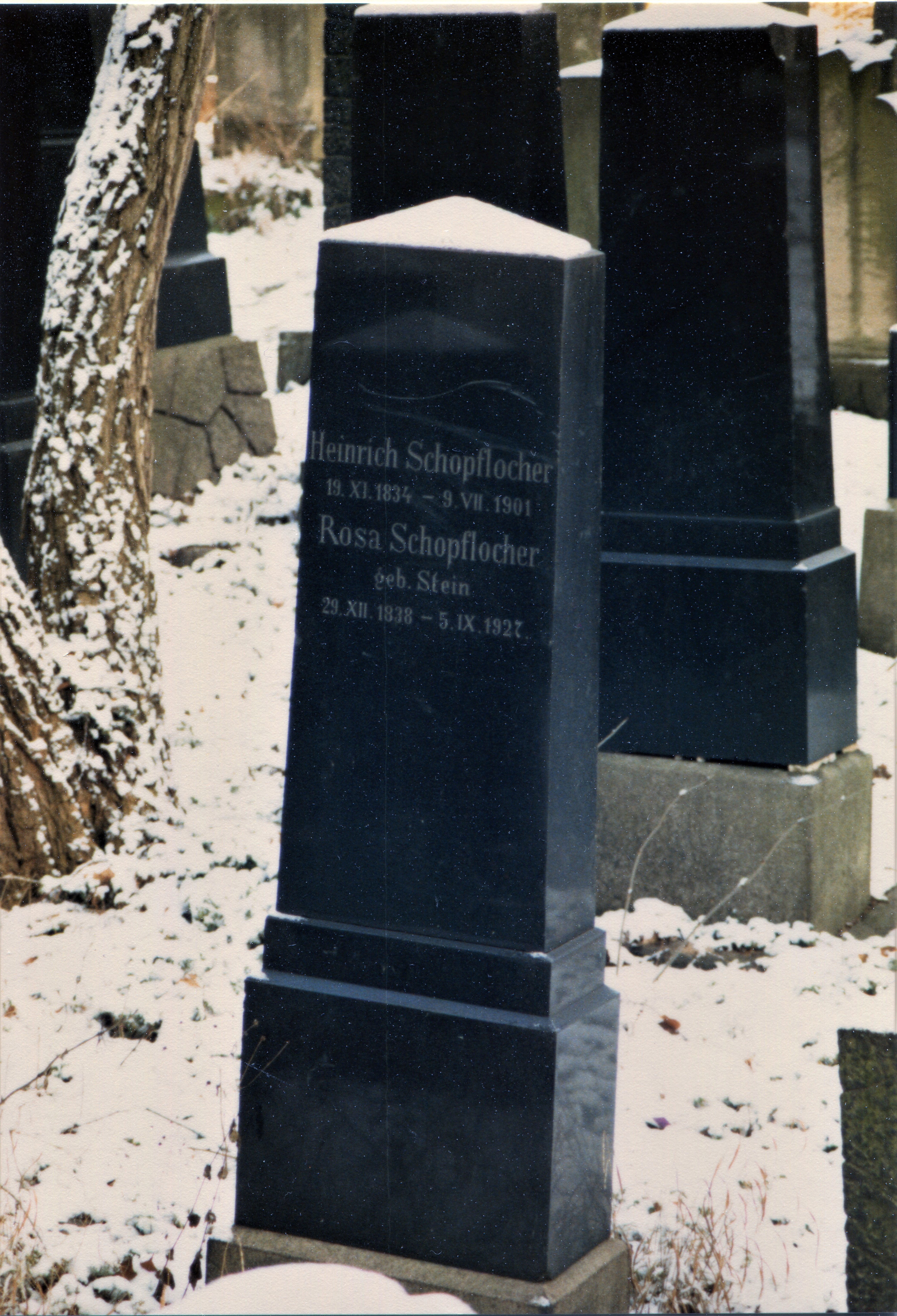 | Beschreibung | Grabstein der Familie Heinrich und Rosa Schopflocher, alter Alter Jüdischer Friedhof in Fürth im Januar 1987 | ||