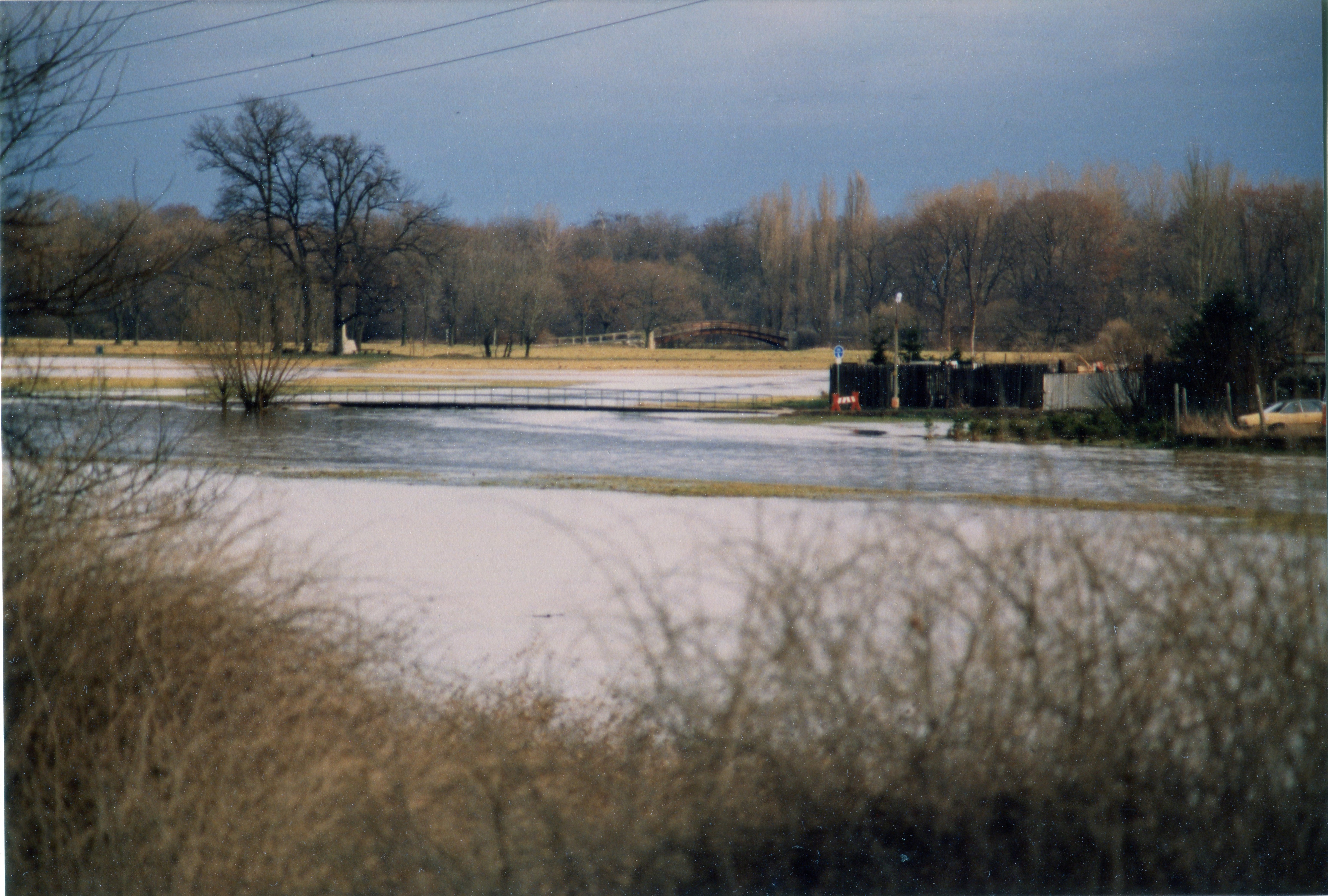 | Beschreibung | Hochwasser im Wiesengrund, Dezember 1986 – Blick über Käppnerweg, Kapellenruh zum Käppnersteg | ||