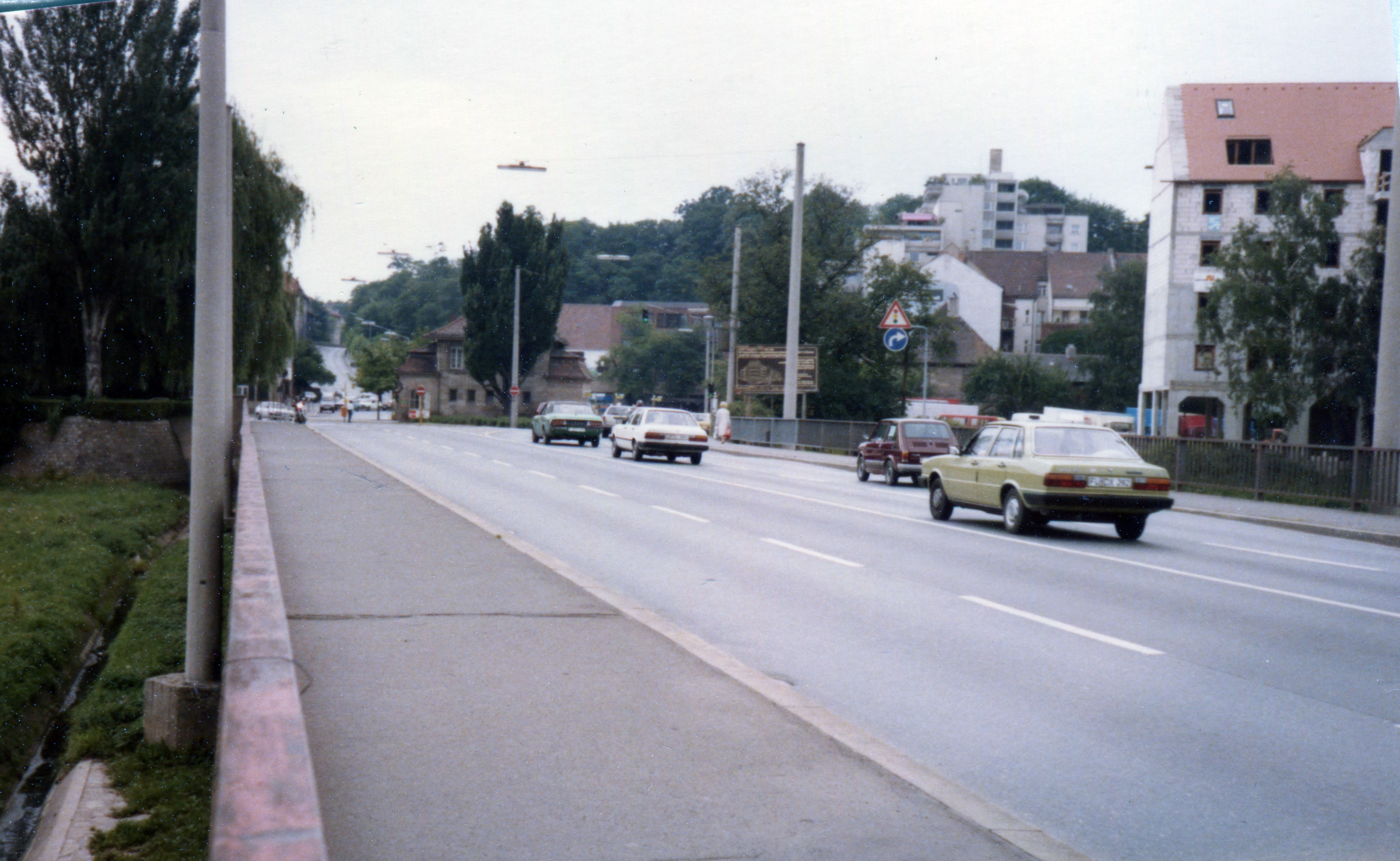 | Beschreibung | Blick über die Flutbrücke zur Billinganlage und dem ehem. Zoll-Stationsgebäude Billinganlage. Rechts Anwesen Billinganlage 2, 4, 6, 8, der eine Flügel ist fertig, aber jetzt Baustopp im September 1985 | ||