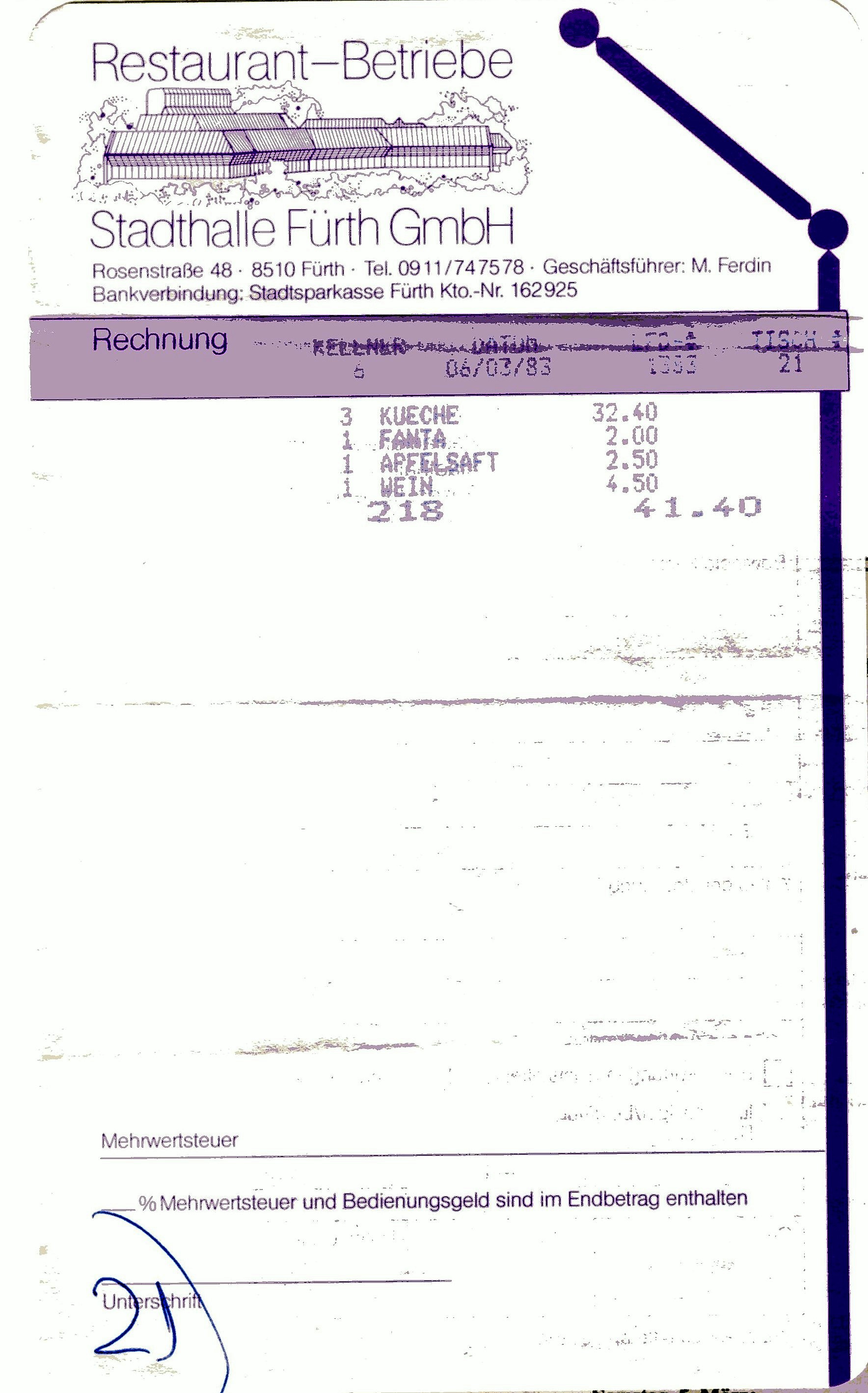 | Dateiinfo (Bild-Unterschrift und Info-Box, automatisch erstellt) | Rechnung vom Restaurantbesuch in der Stadthalle vom März 1983 Urheber: Restaurantbetriebe Stadthalle<br><br>Lizenz: cc-by-sa-3.0 | ||