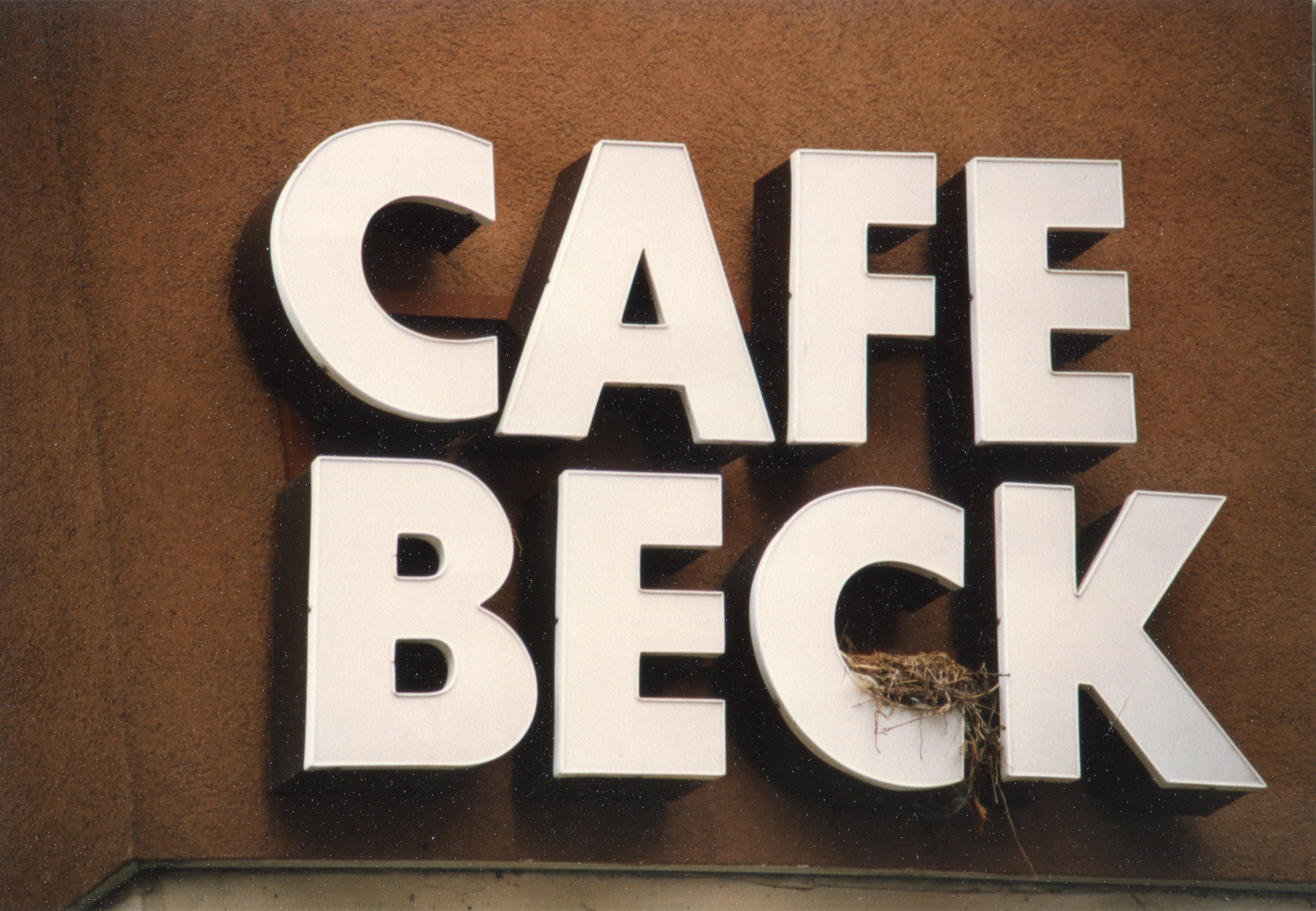 Fassadenwerbung des ehem. Cafe Beck in der Geleitsgasse mit gefiederten Untermietern im September ... Fassadenwerbung des ehem. Cafe Beck in der Geleitsgasse mit gefiederten Untermietern im September 1986<br>Urheber: Klaus-Peter Schaack<br>Erstellungsdatum: 3. September 1986<br>Lizenz: cc-by-sa-3.0