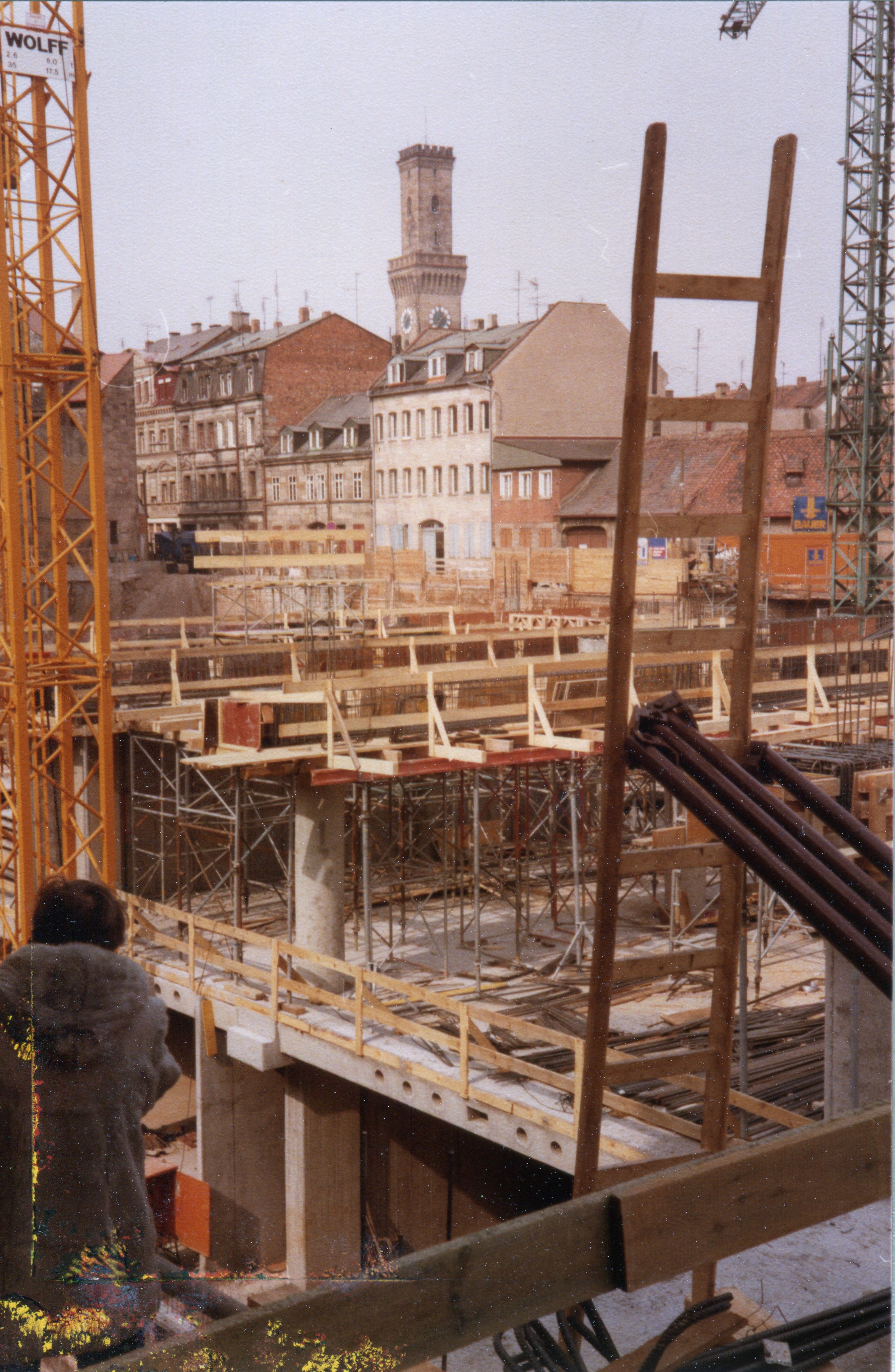 | Beschreibung | Baugrube City-Center - im Hintergrund über die Bäumenstraße der Rathaus Turm am 8.1.1984 | ||