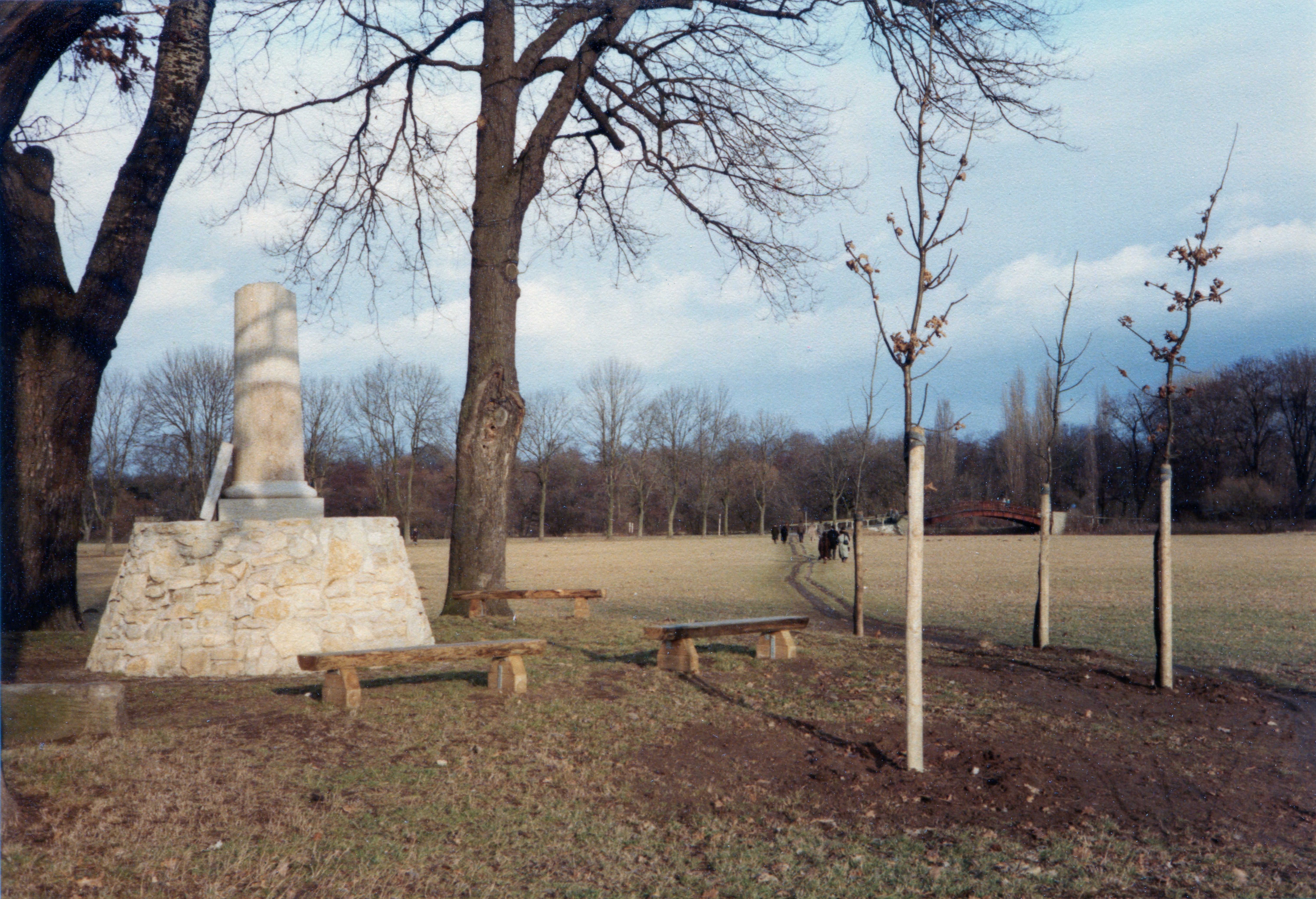 | Beschreibung | Gedenkstein der Martinskapelle mit neu gepflanzten Bäumen, Januar 1984 – im Hintergrund der ehem. hölzerne Käppnersteg | ||