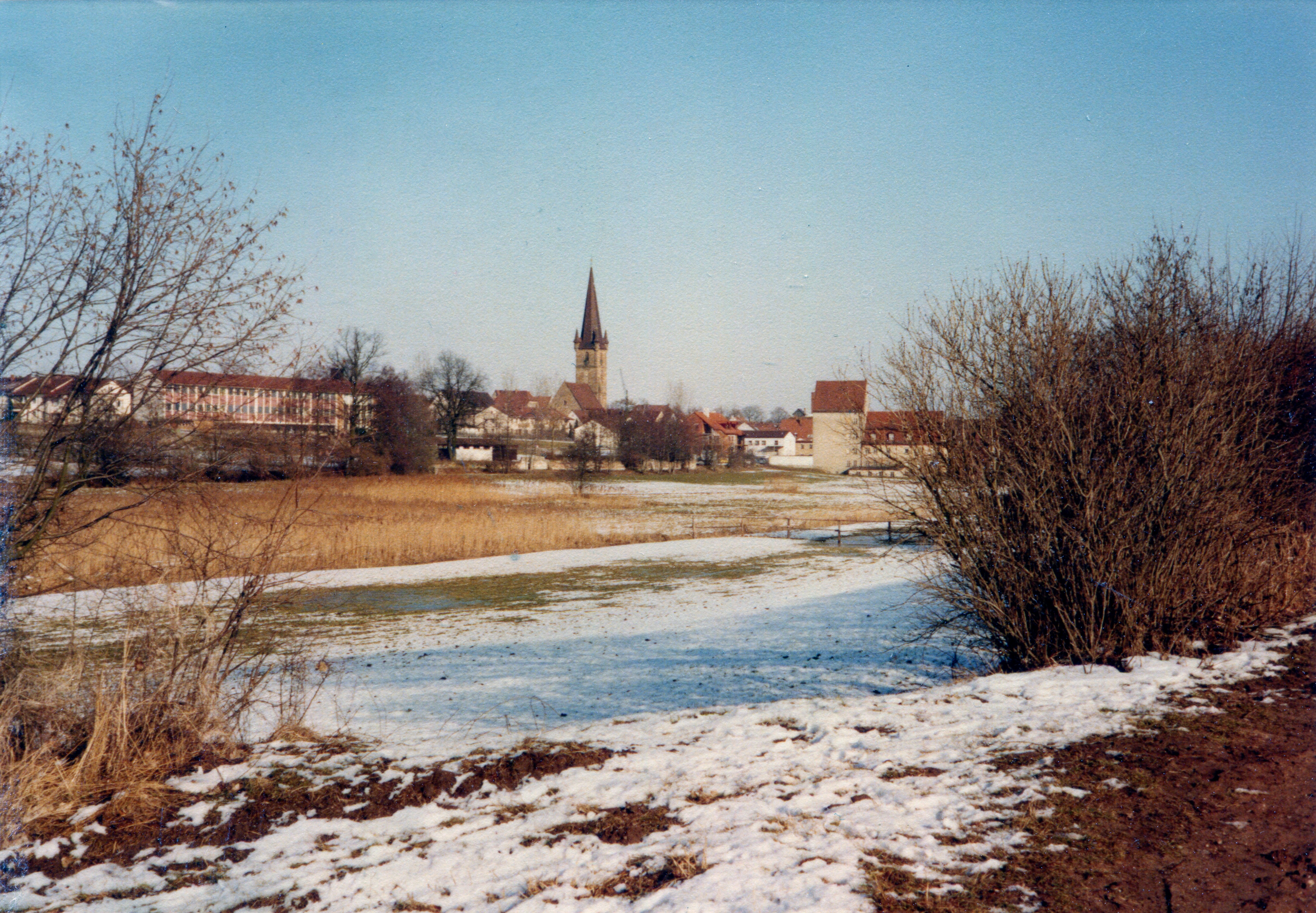 | Beschreibung | Die Kirche St. Johannis und die Farrnbach-Schule in Burgfarrnbach im Febr. 1984 | ||