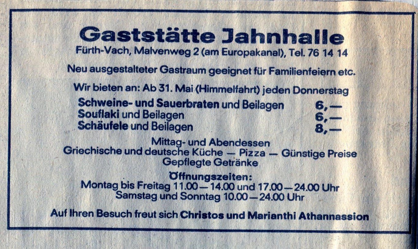 | Beschreibung | Inserat der Sport-Gaststätte des Turnverein Vach 1903 e. V. April 1984 | ||