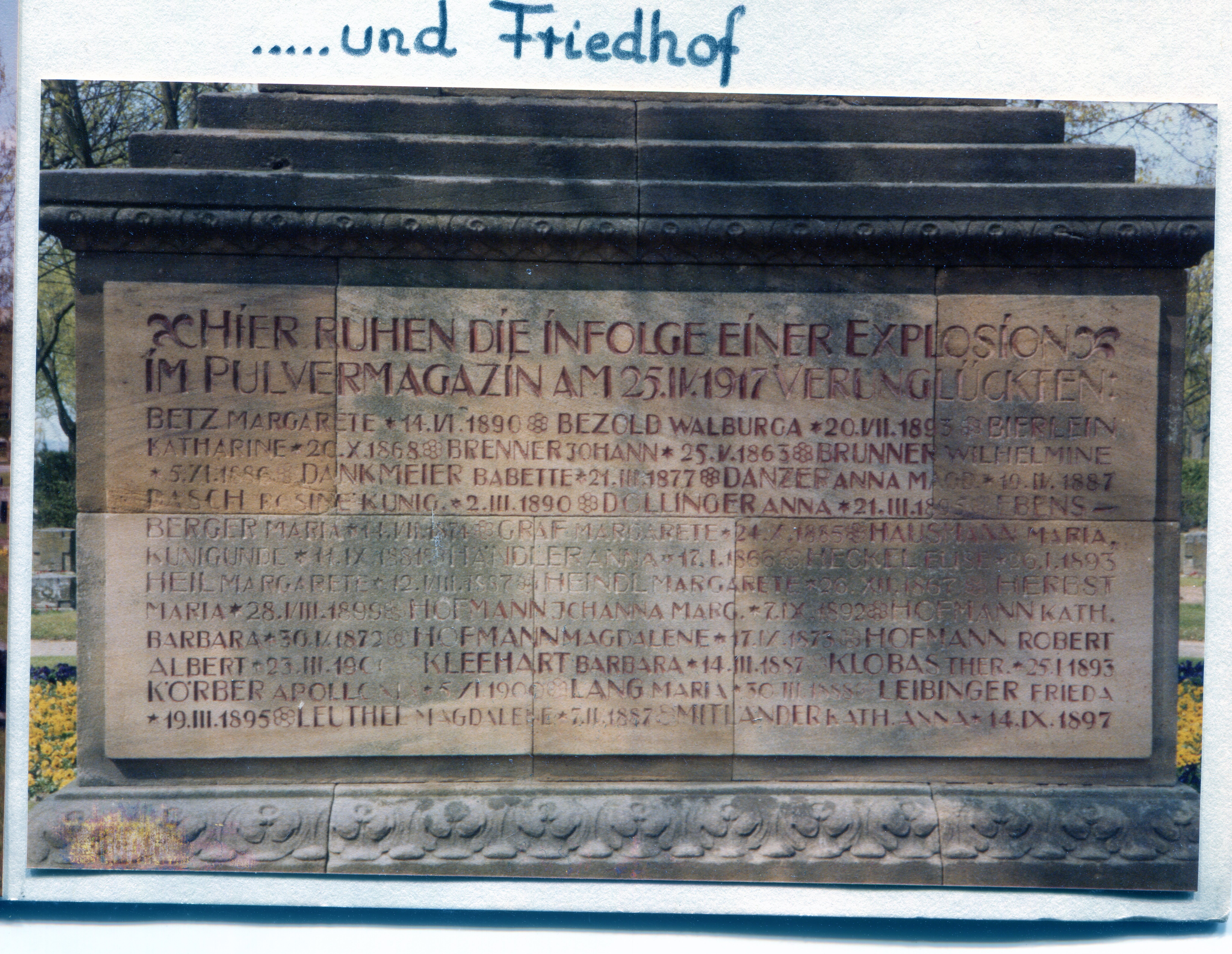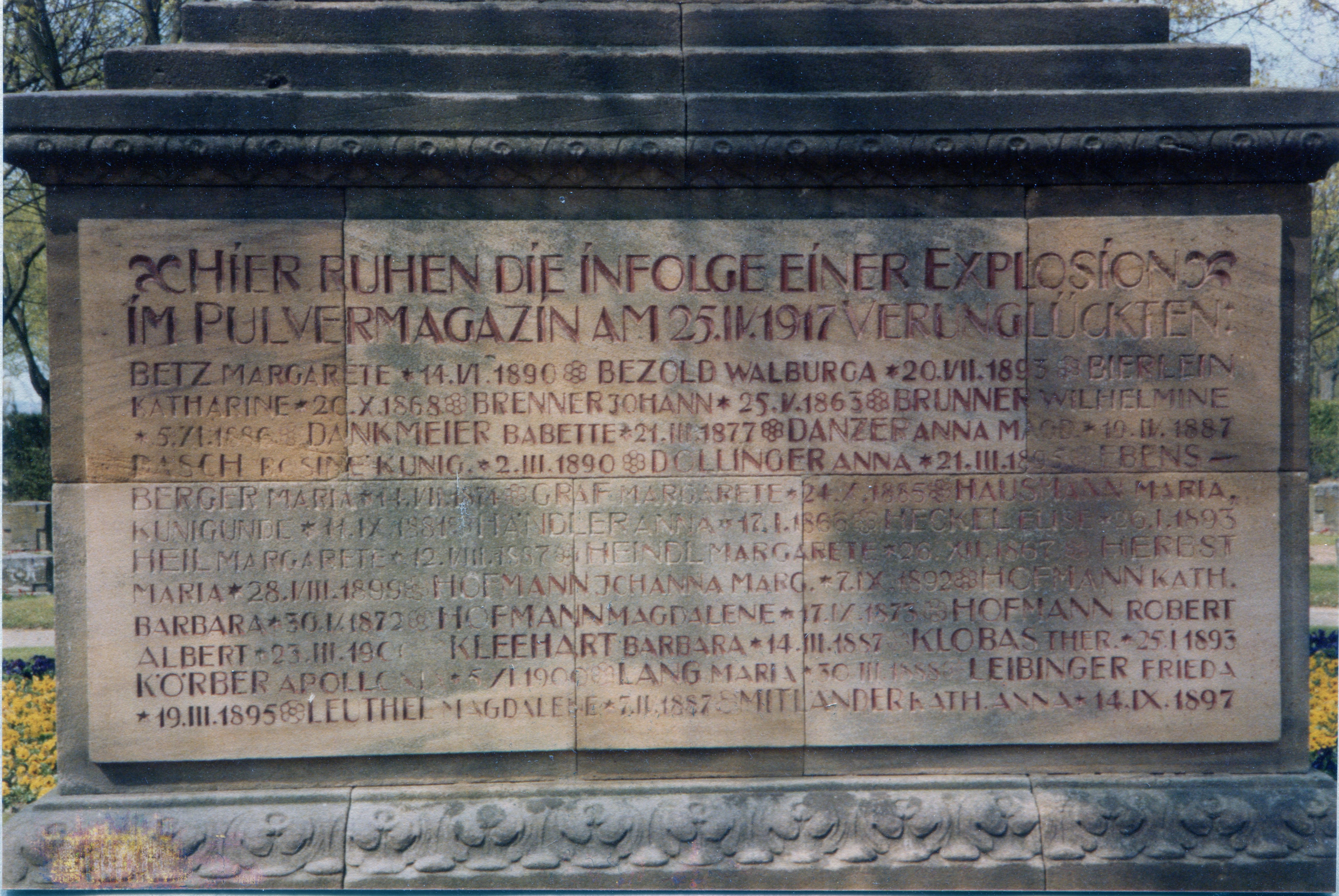| Beschreibung | Denkmal des Brandunglücks im Pulvermagazin 1917 auf dem Fürther Friedhof, April 1984 | ||